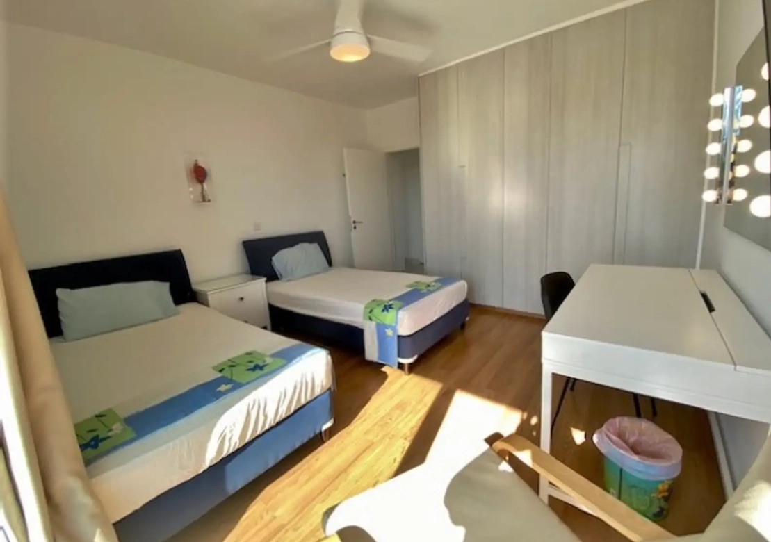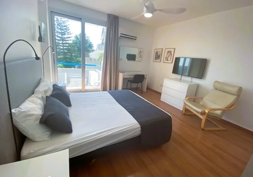 The master bedroom has a 150×200 double bed, a desk, a 2.5m long wardrobe, a 32-inch smart flat-screen, a ceiling fan, an A/C, and a veranda overlooking the sea, garden, and pool area. The second bedroom has two single beds 110×200, a 32-inch smart flat-screen, a desk with actors’ mirror and lights, a 2m long wardrobe, a ceiling fan, an A/C and a veranda with the same beautiful view.
