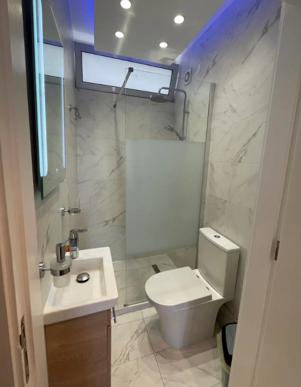The blue led lights and the spotlights give a nice touch in the sitting room area and bathrooms. The high windows are operated electrically and help in the flat ventilation.