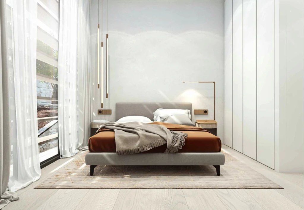 The architectural solution is, on the one hand, laconic, but after a closer look, it unravels a multitude of well-conceived details, providing the villa owners with maximum comfort. An exquisite style and well-conceived functionality have found their unique blend in the inner courtyards, high-ceilinged living rooms fitted out with panoramic windows, spiralling staircases, etc.