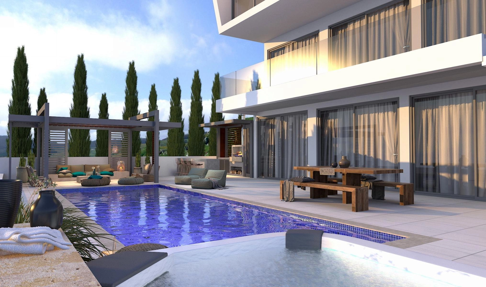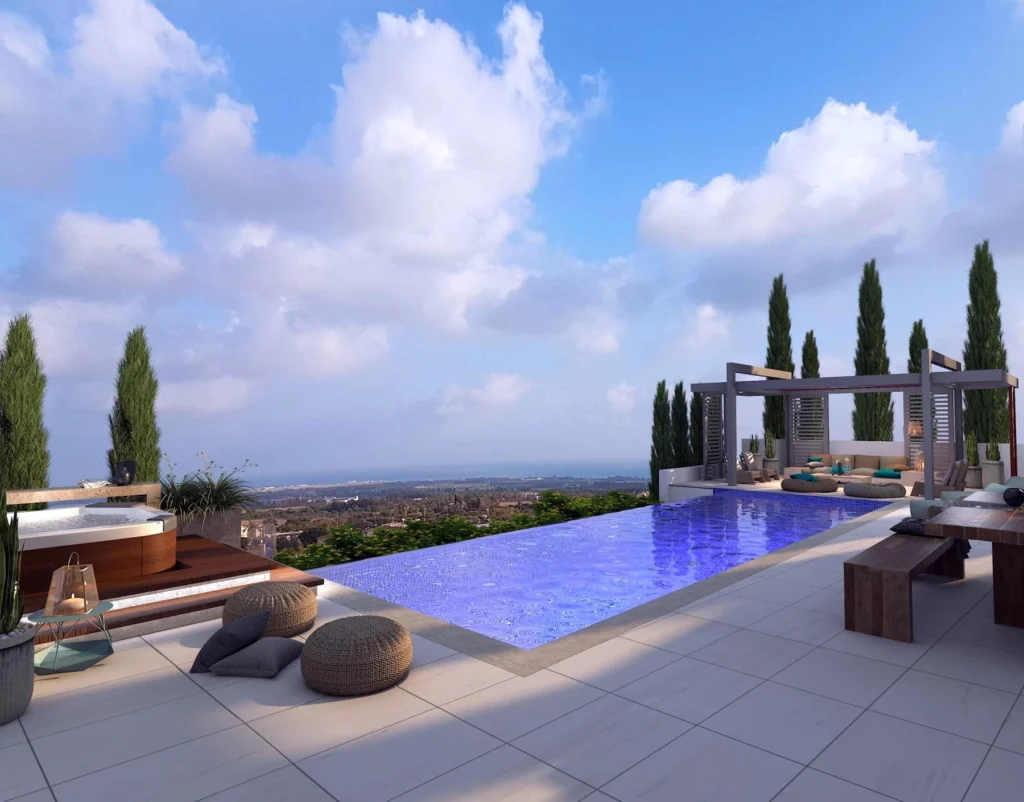 The luxury villas are located on a superb hilltop location with panoramic sea views in a prime residential Pafos suburb – Geroskipou. The location is extremely convenient, as it is close both to the village centre with a plethora of amenities and to Pafos, where you can find anything one possibly needs, including shops, restaurants, schools, banks, hospitals, government office and business centres. It is also in good proximity to the highway which means easy and quick access to Limassol and beyond. A beautiful strip of sandy beaches with wave breakers, numerous cafes, changing facilities and watersports is within easy reach.