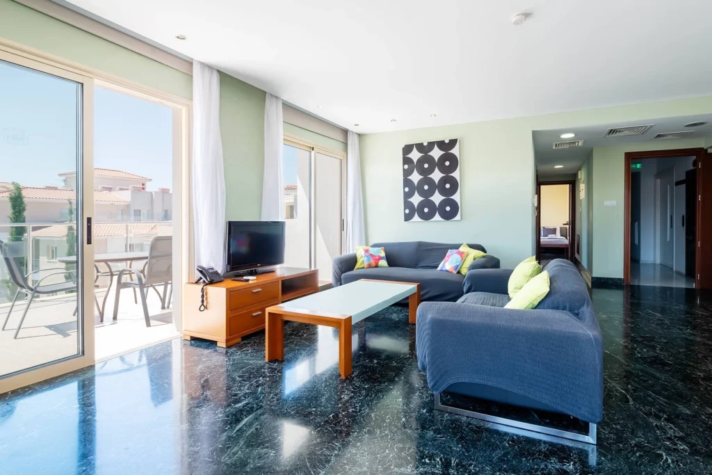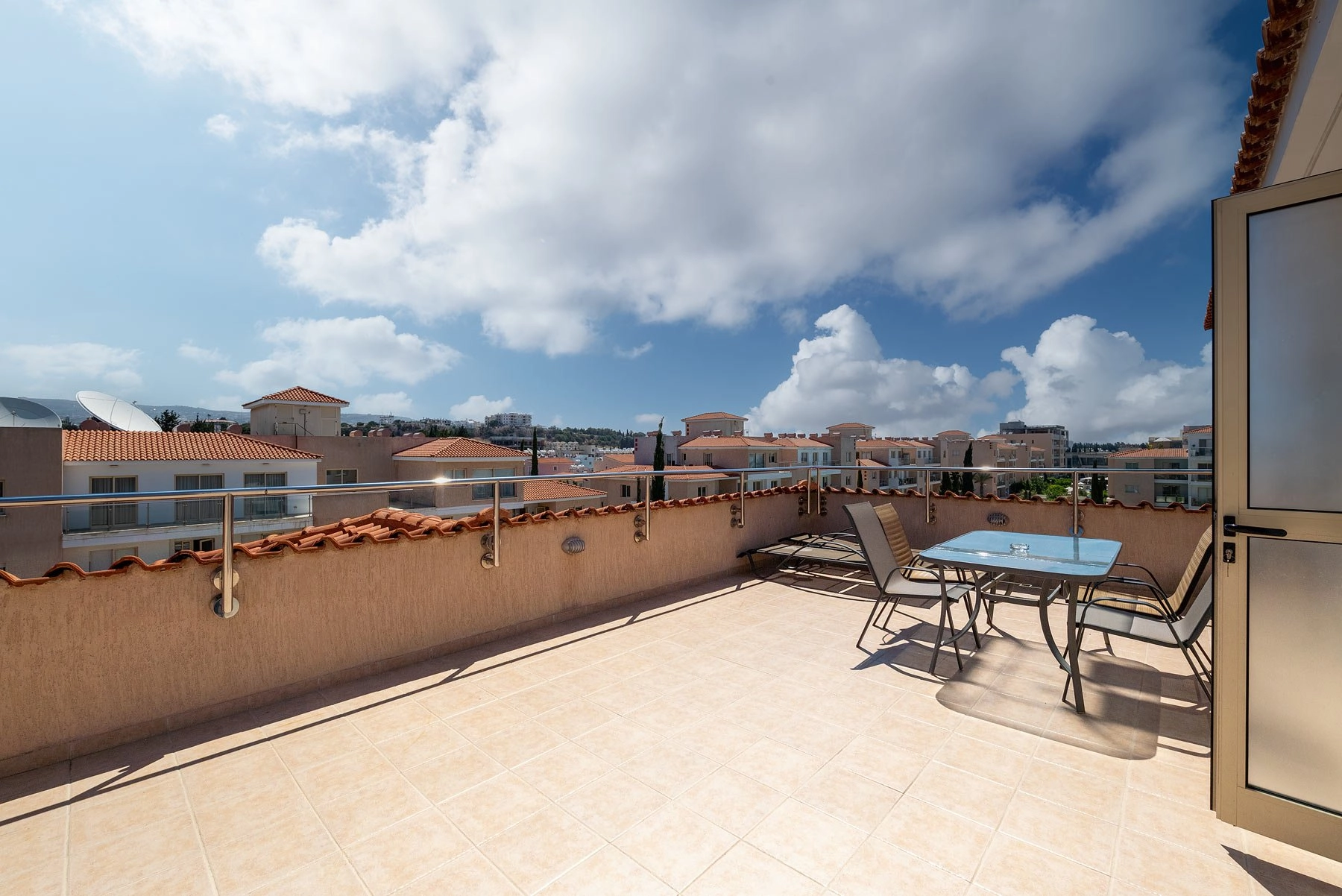 A lovely 3-bedroom penthouse in one of the most sought after residential complexes in Pafos. Secure gated complex Elysia Park has long earned a reputation of the best holiday let and residential destinations in the tourist area of Pafos, comprising 12 blocks of apartments, townhouses, huge overflow pools and all the amenities including a restaurant, SPA, gym, covered pool, mini market, pharmacy, as well as property management and concierge services. It is only 1,5 km to the beach and very close to hospitals, banks, supermarkets and other city amenities.