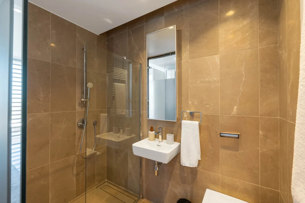 One of the two master bedrooms with en-suite bathroom is on the entry level, whereas the two other rooms are on the lower floor with the pool and the garden.