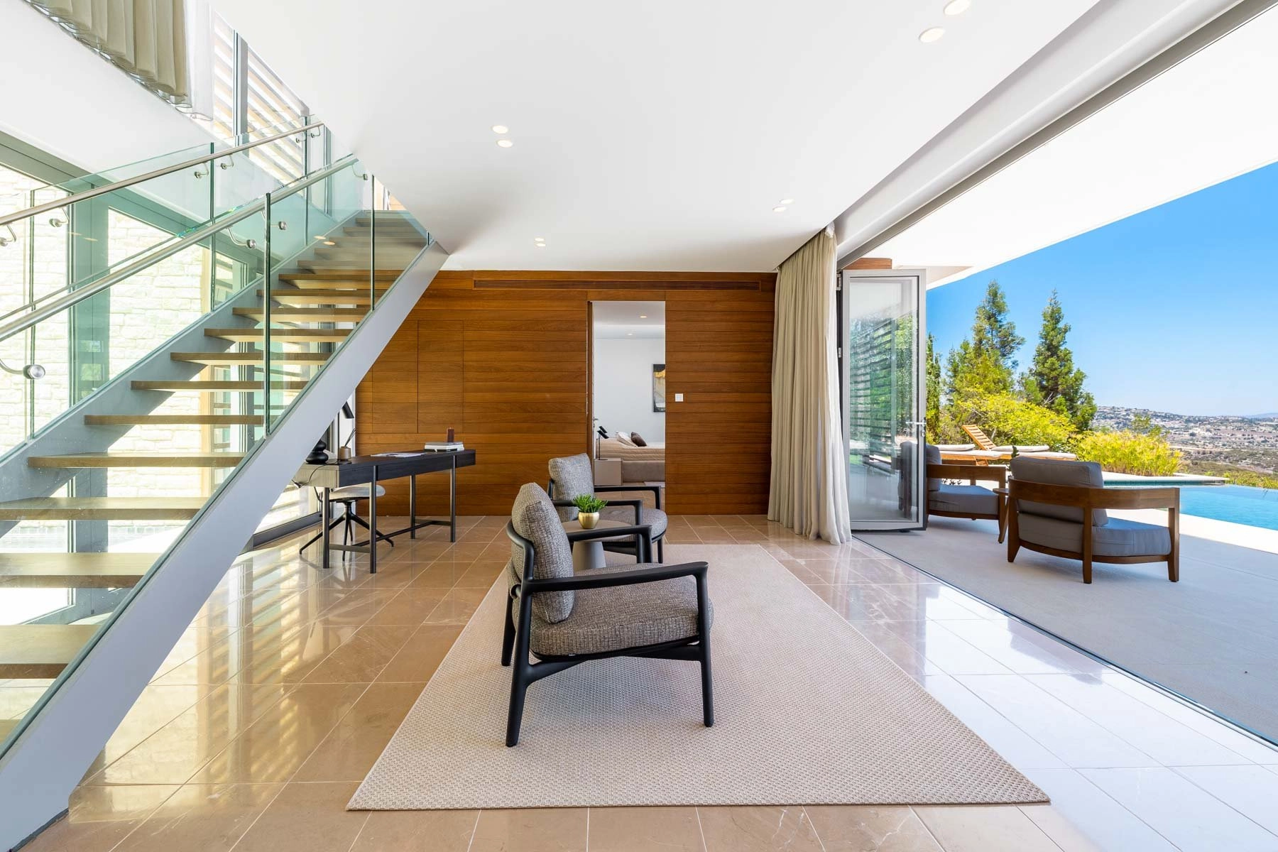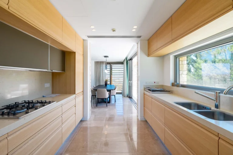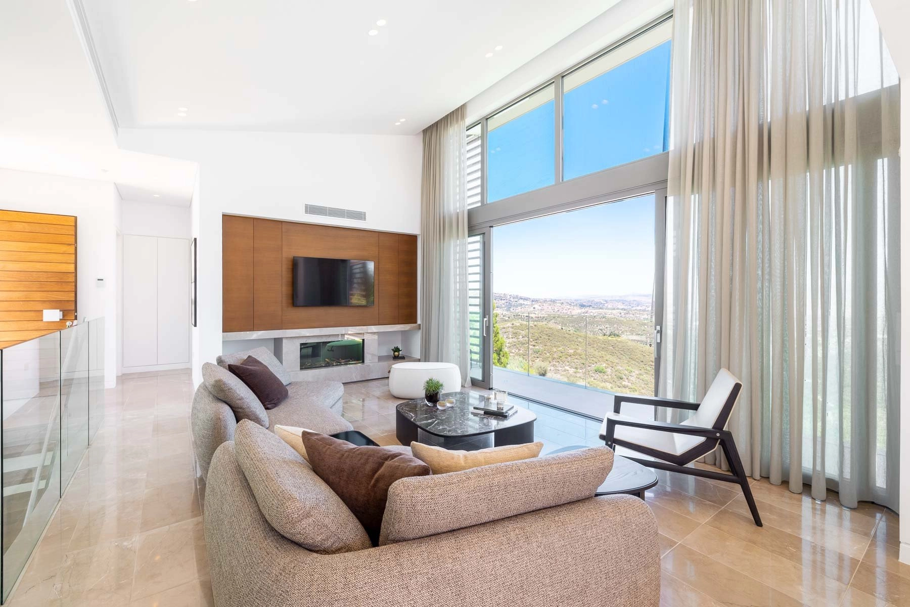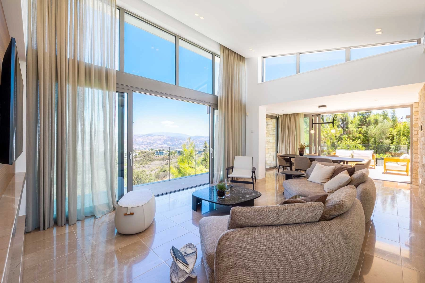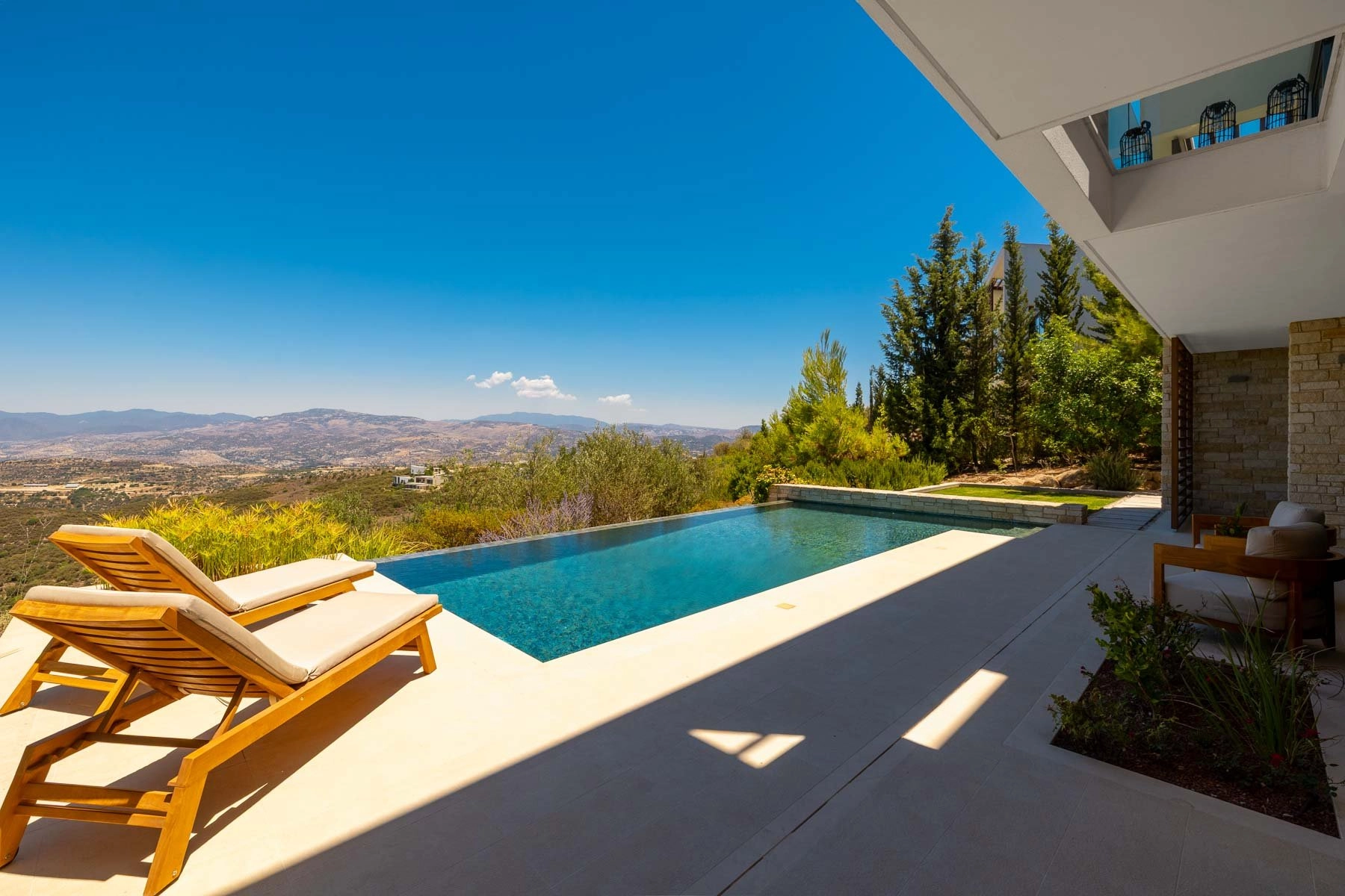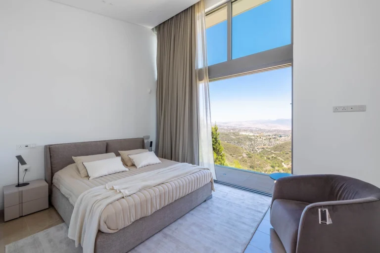 The entry level living area is all about abundance of light, having 4,5 metre high ceiling and panoramic windows with views to the picturesque Troodos mountain gallery. Spacious living room with a fireplace connects with a dining area and the kitchen and then extends further as an outdoor bbq area and the summer kitchen.
