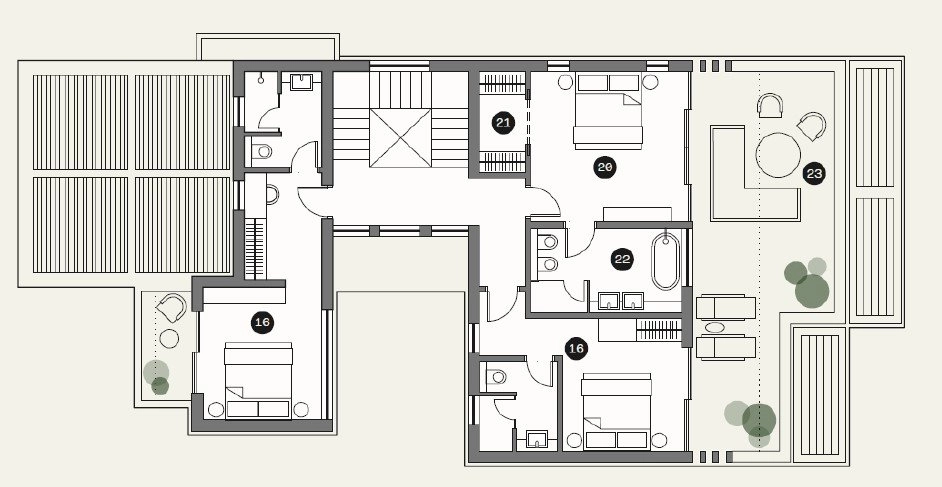 These villas, situated in good proximity and easy access to the Golf Club, Wellness area and cafes/restaurants/shops hub, are of four different types – with three, four, five and six bedrooms. All villas have sizeable plots with private swimming pools and landscaped gardens. Villas will have two levels where on the ground level area there at least one bedroom, as well as the living spaces with access to the backyard garden area. On the top (second) floor there are only bedrooms with terraces. All bedrooms are en suite.