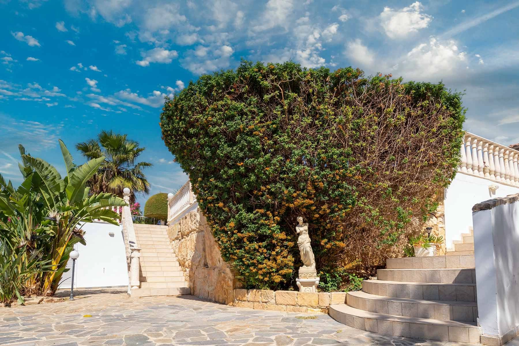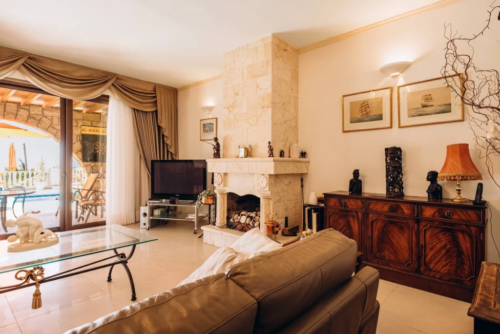 The secluded bungalow on a large gated plot is surrounded by manicured gardens and offers spectacular mountain and sea views. On the top level, there is a vast terrace with various seating areas, a barbecue area, a dining area, and a large swimming pool with panoramic views. The impressive entrance hall offers individual access to all rooms. The open-plan family room, dining room, fully fitted kitchen, and laundry can be accessed through double doors. The spacious lounge features an open wood-burning fireplace, a recessed vaulted ceiling, and patio doors with sea views. The middle hall with arched stained-glass windows provides access to three bedrooms, three bathrooms, and a guest toilet. The master suite bedroom has double patio doors with sea views and pool access. It also leads to a large separate dressing room and a very spacious main bathroom. The property boasts high specifications, including solid wood internal doors, double-glazed high-quality windows and patio doors, and natural stone features.