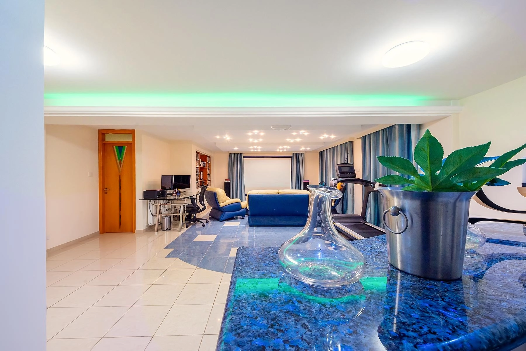 The house is divided into four levels: the cellar, the ground floor, the first floor, and the attic. There are five bedrooms with high-quality semi-solid parquet flooring, four of which are en-suite, as well as an open-plan main kitchen with Gaggenau electrical appliances and a granite-covered work top and a guest kitchen in the basement. For music lovers, there is also a home theatre with a huge screen and a surround sound system.