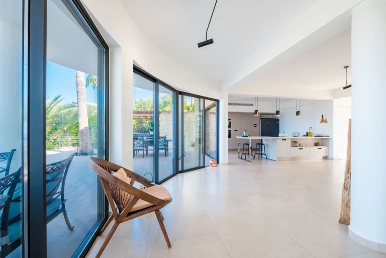 Entering the property through glass entrance doors, you reach the generously sized living area via a practical entrance hall. The spaces of the open plan living area are well-zoned with a separate TV room space, a stylish round 8-seater dining spot, a kitchen with comfortable breakfast zone and, of course, all this with sea views that need to be seen.