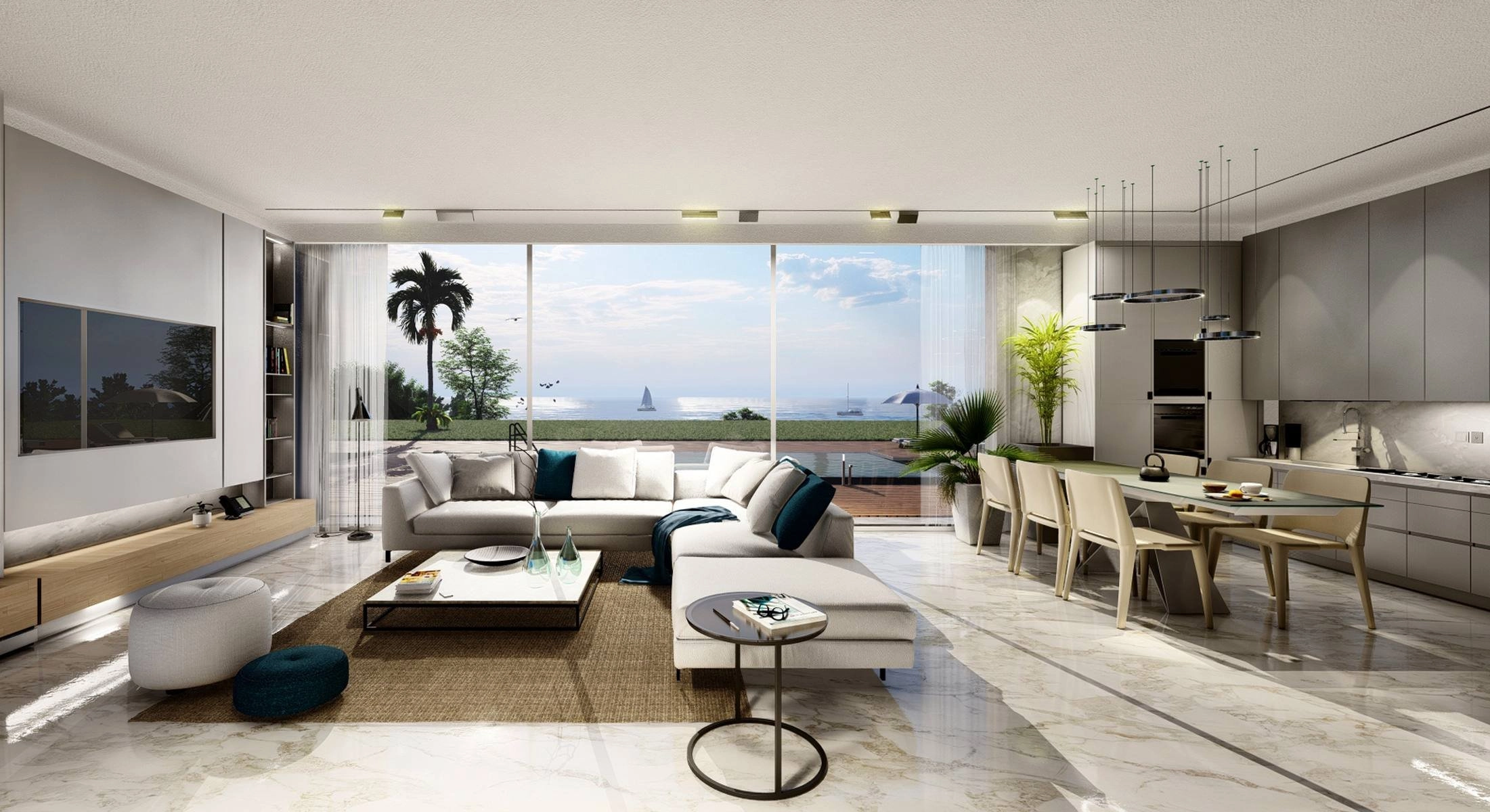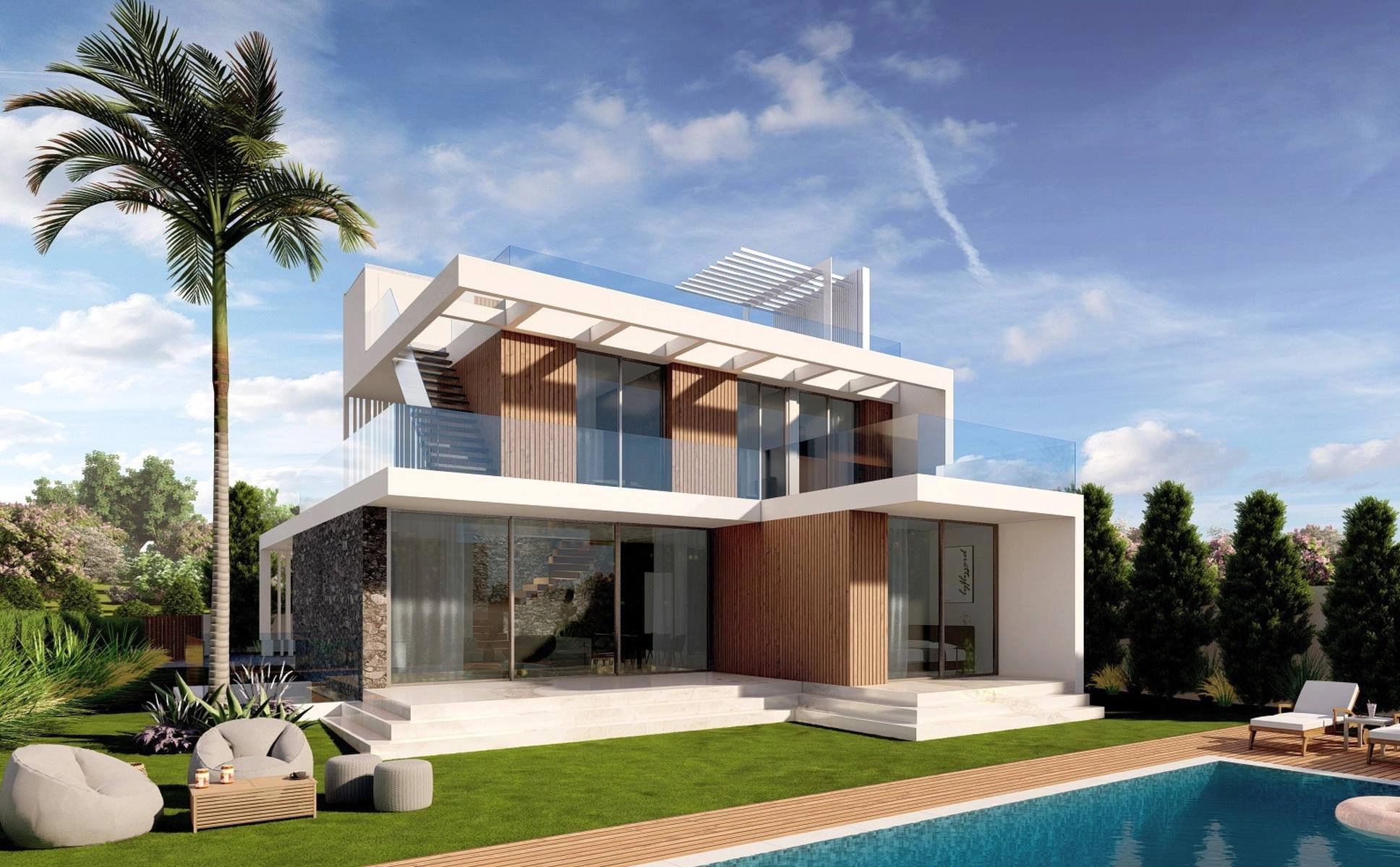 The architecture is crucial in setting the relaxed tone: each residence is designed as a beach house with its own pool, terraces and two private covered parking spots. The white facades contribute even more to the mood, while the cladding that vary from natural stone to resin or wood giving a homey and luxurious feel.