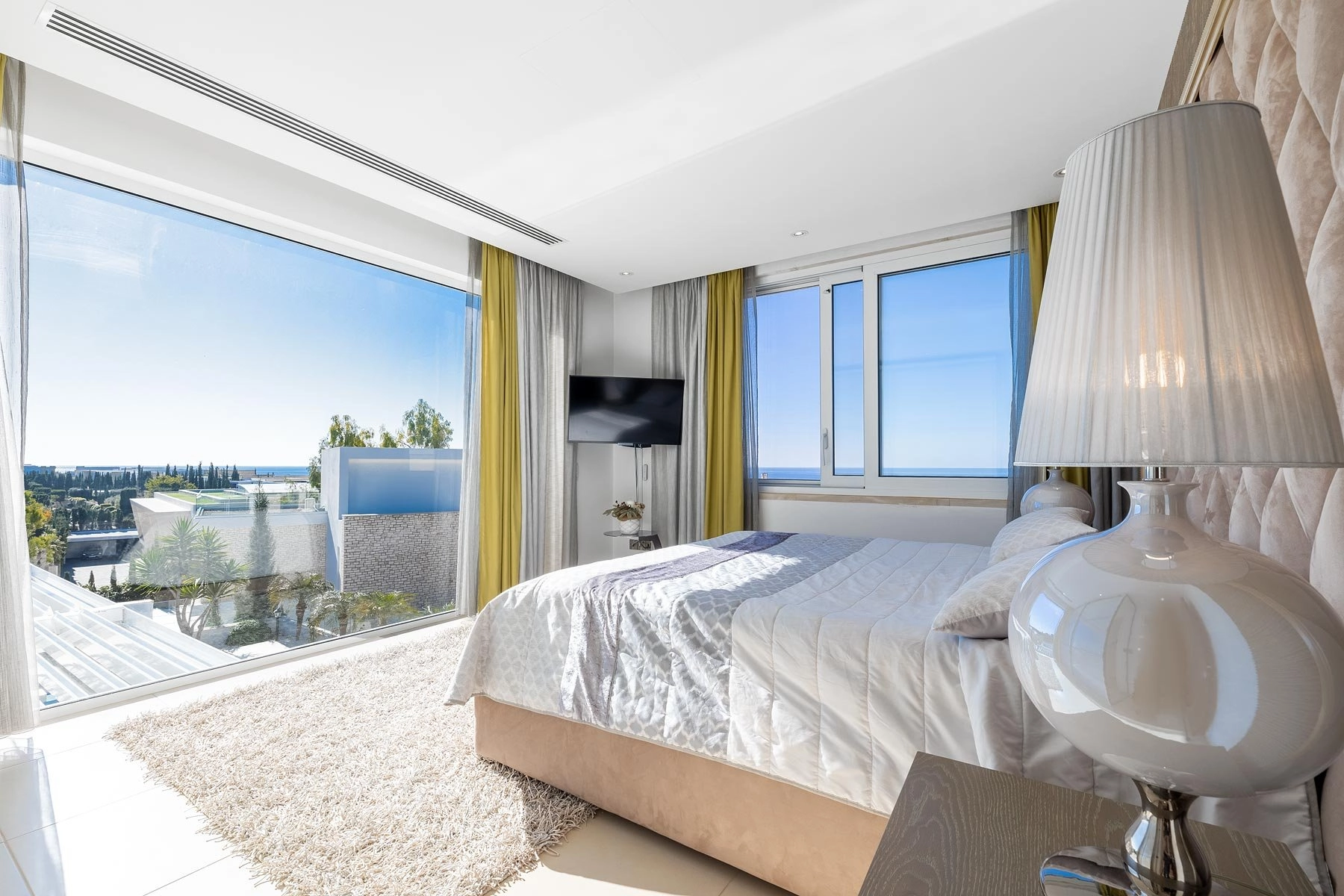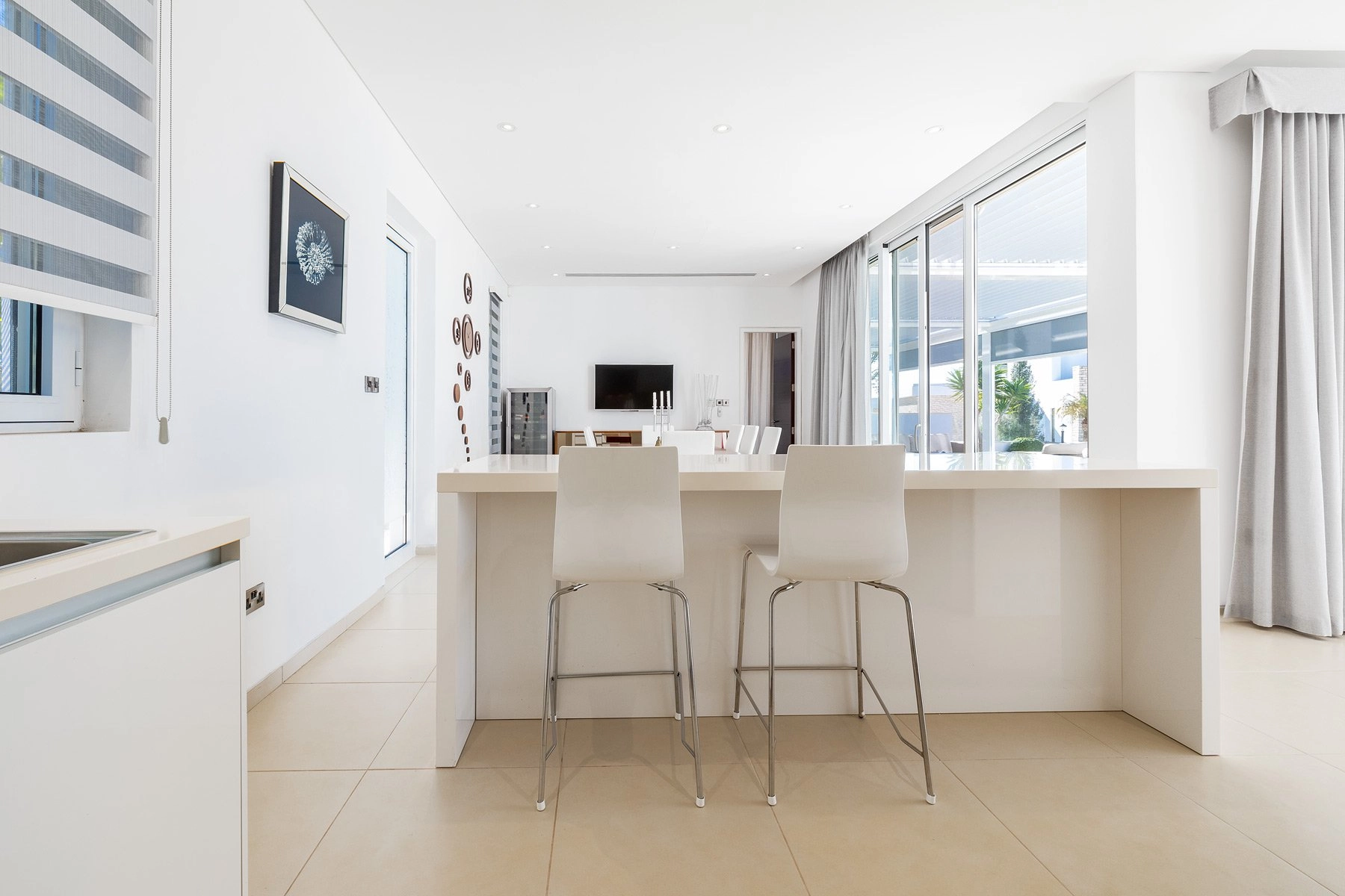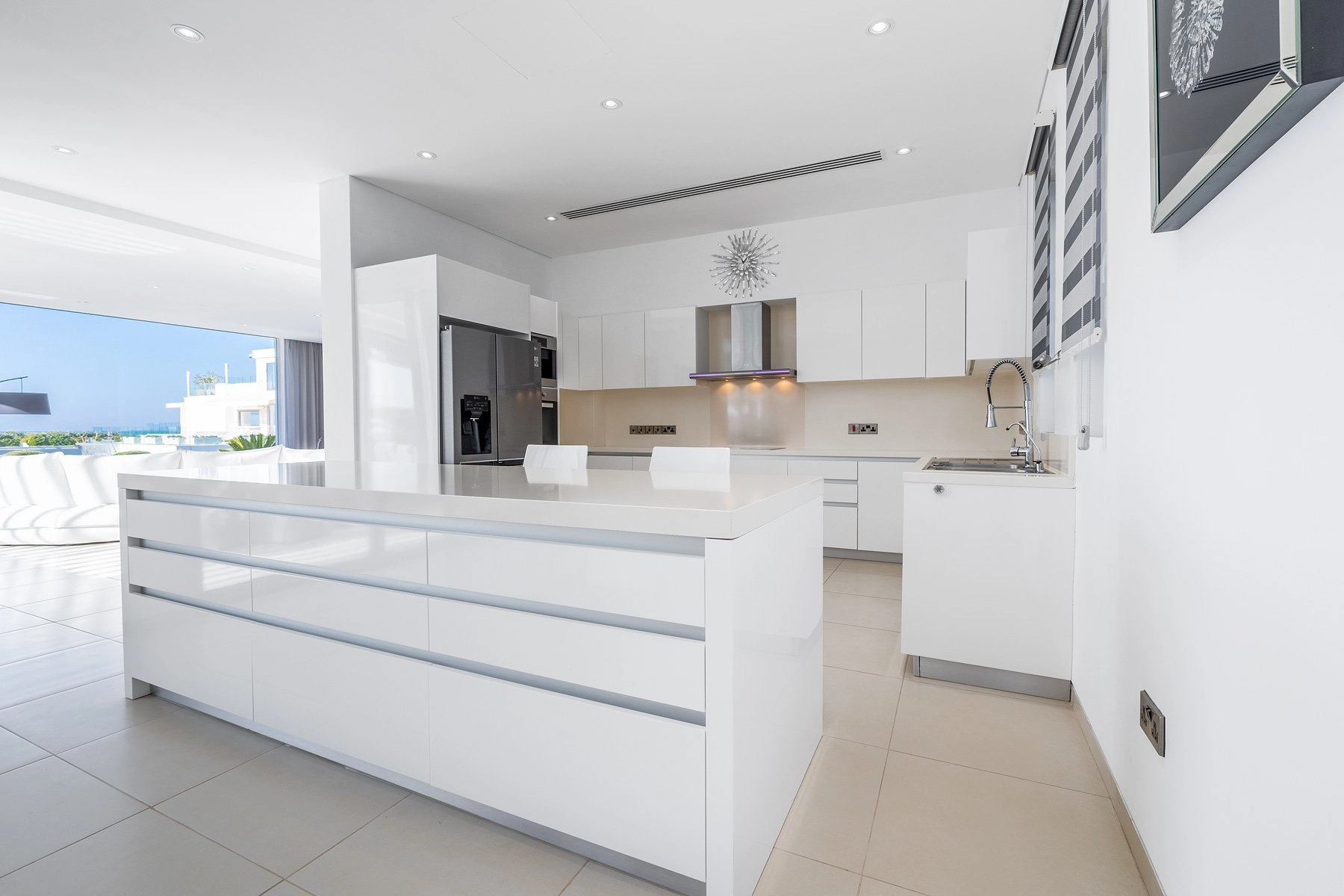 The villa, set on three levels, features an amazing spacious sunlit living room, an equally large modern kitchen and dining room, and one of the bedrooms on it’s ground level. The remaining three bedrooms are tucked away on the top floor, all featuring amazing views, tastefully selected top quality furniture, and huge bathrooms. All the living areas boast floor-to-ceiling windows, VRV air-conditioning, spotlights, and underfloor heating.