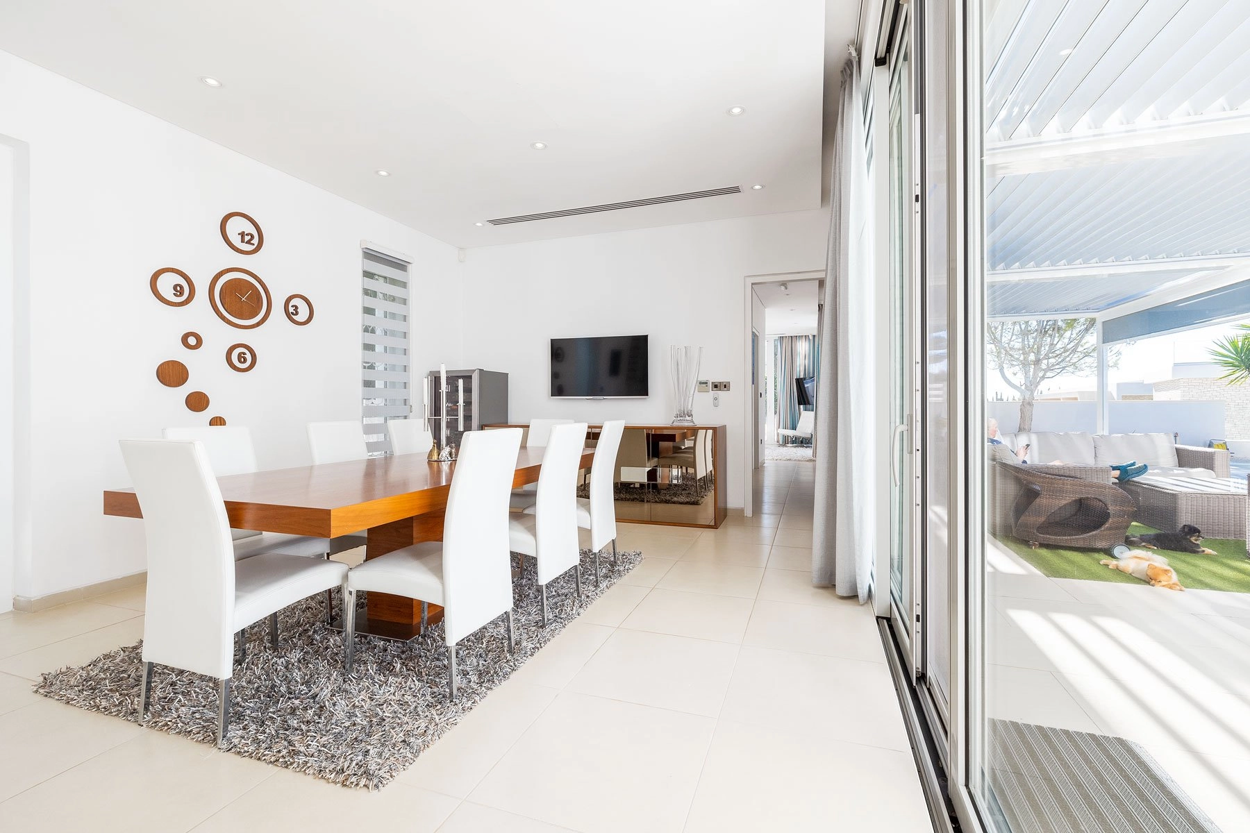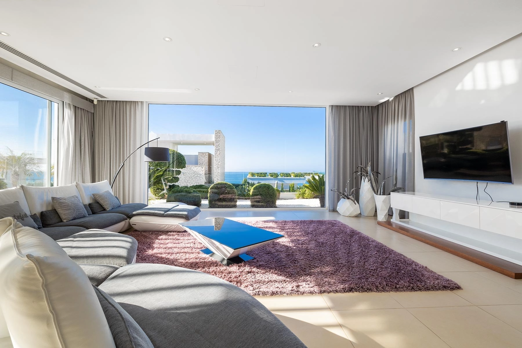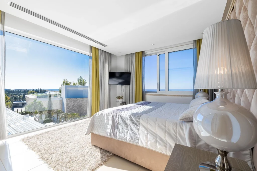 The villa, set on three levels, features an amazing spacious sunlit living room, an equally large modern kitchen and dining room, and one of the bedrooms on it’s ground level. The remaining three bedrooms are tucked away on the top floor, all featuring amazing views, tastefully selected top quality furniture, and huge bathrooms. All the living areas boast floor-to-ceiling windows, VRV air-conditioning, spotlights, and underfloor heating.