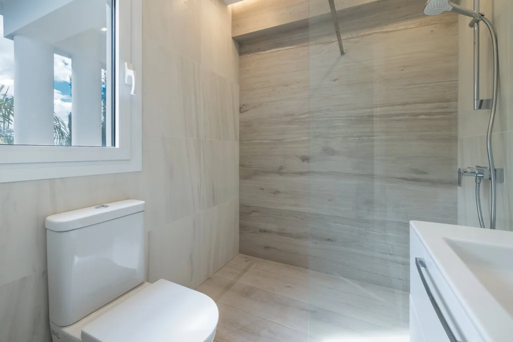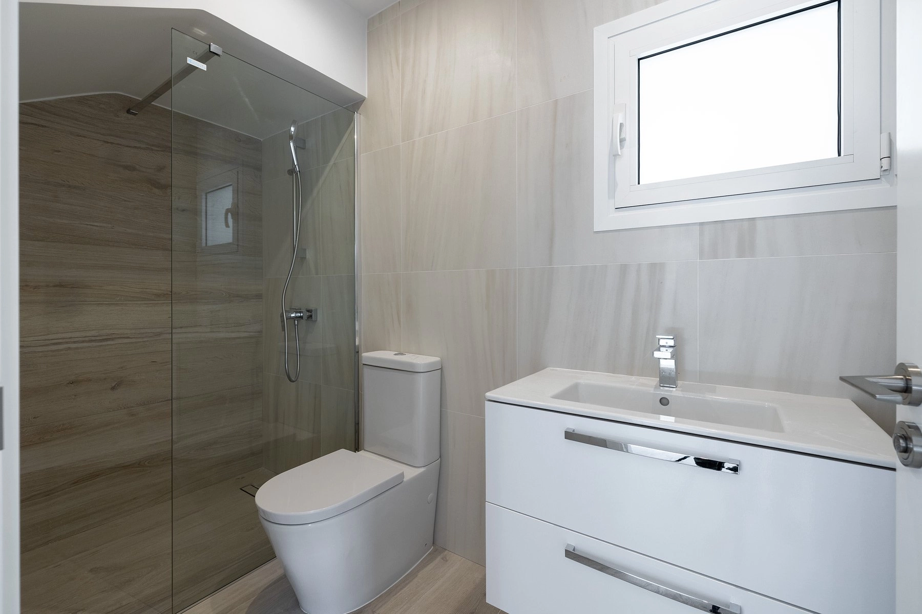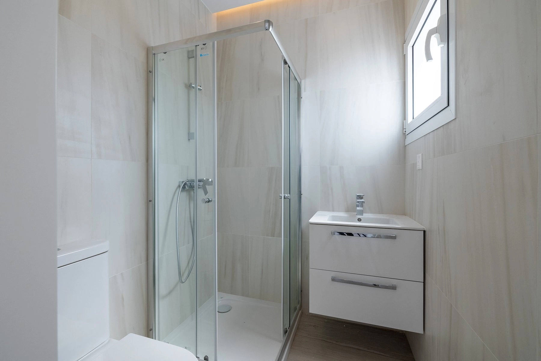 The bedrooms occupy 2 levels: the first floor offers a semi-guest space with a separate exit to the garden, two bedrooms with a shared bathroom, and a small, but very useful, storage space. The second floor has two spacious master bedrooms with en-suite bathrooms and some beautiful sea views.