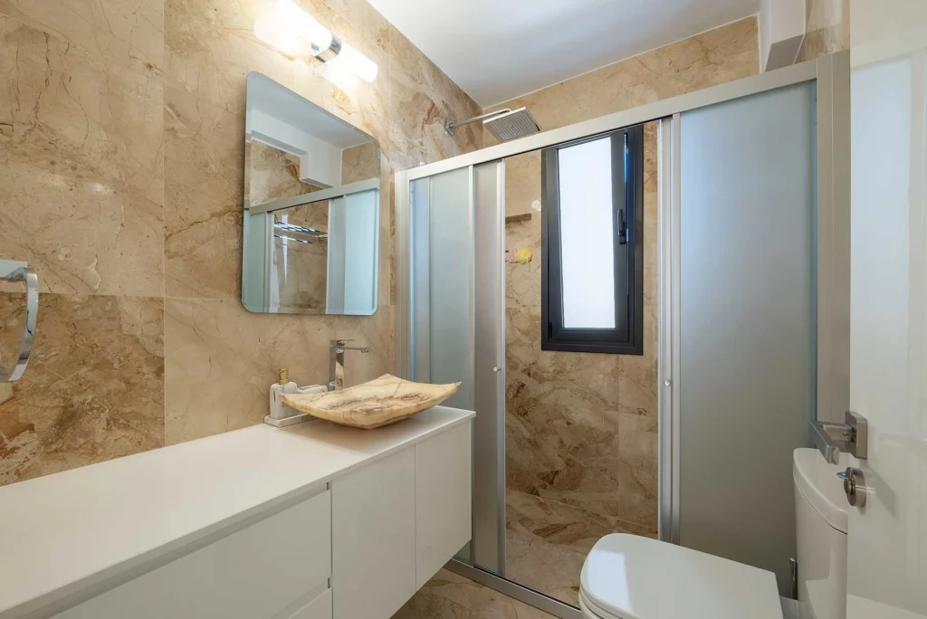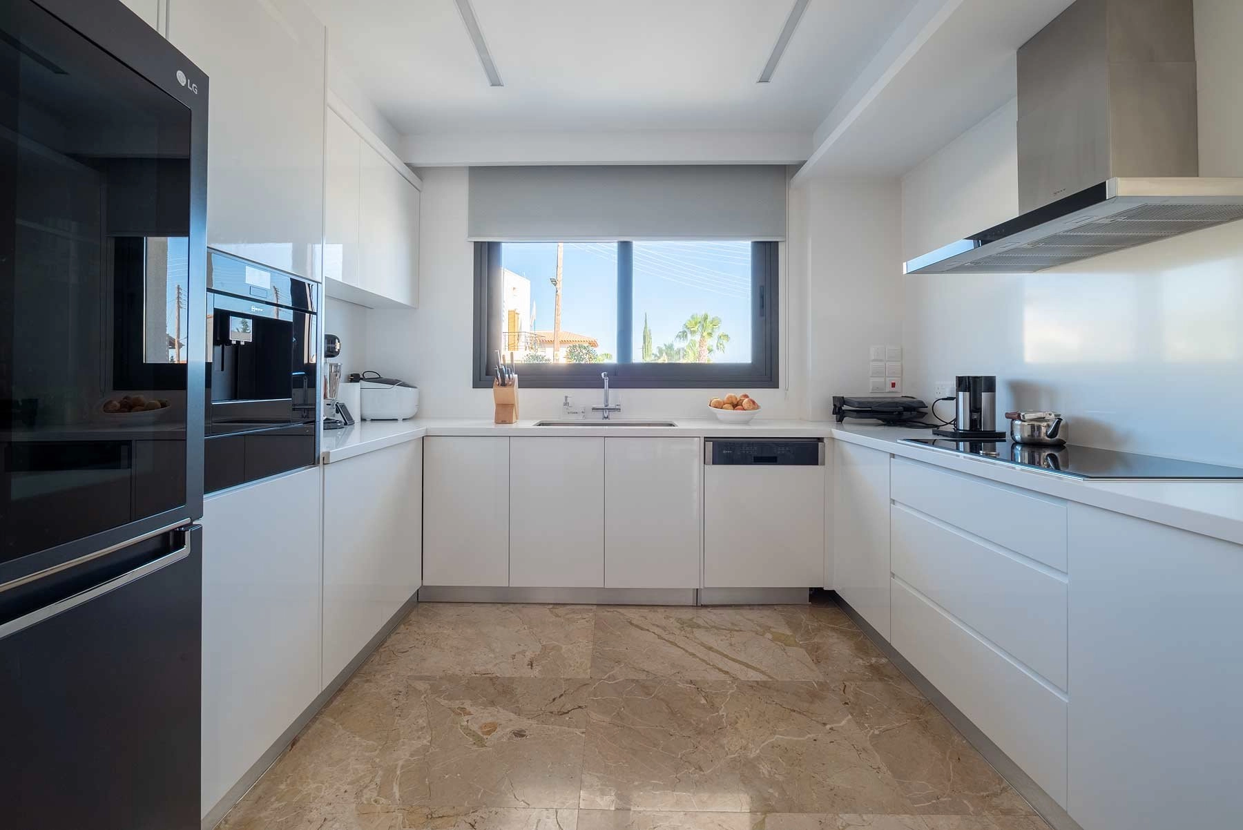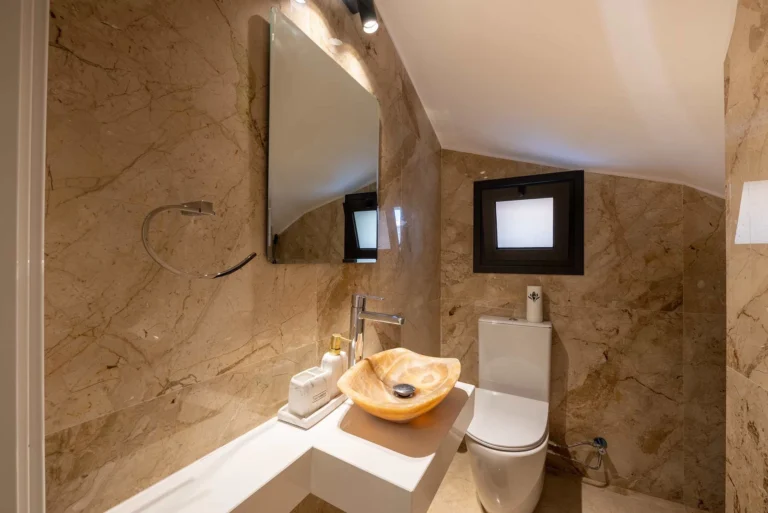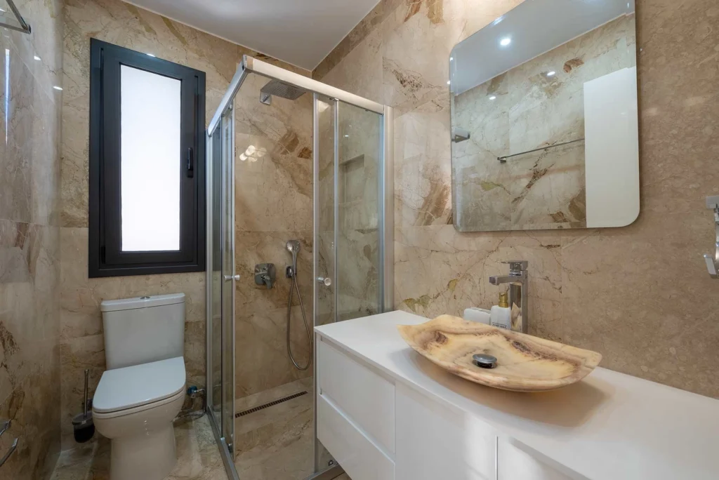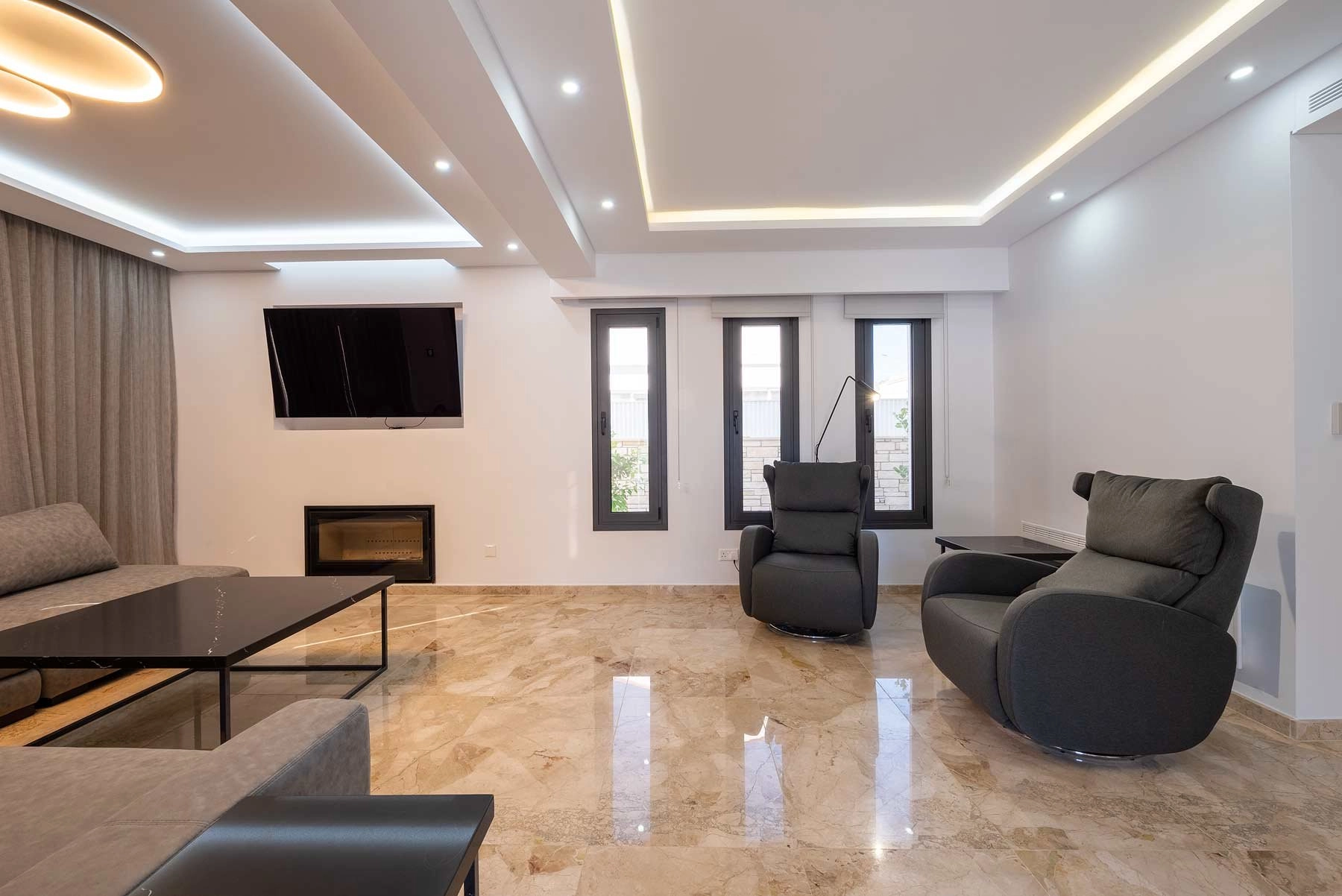 Each room has radiators for heating in winter and modern ΜΤSUBISHI air conditioners to keep cool and comfy in the summer months. All appliances in the house have A+++ energy efficiency, and the FRONIUS solar panels and batteries will help you avoid huge bills. The living room has a modern fireplace and you can spend winter evenings listening to the wood crackle. The modern kitchen is equipped with ΝEFF built-in appliances.