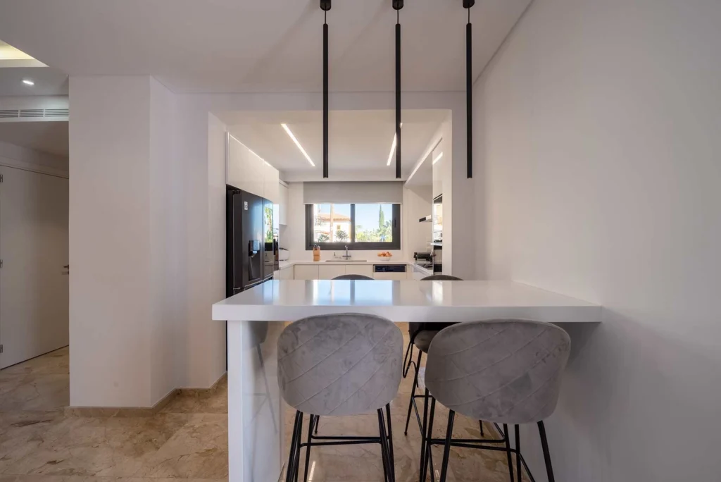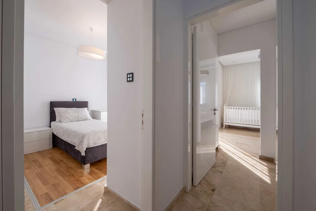 The first floor of the villa offers a kitchen, a spacious living room with a dining area and an extra lounge room with comfortable Italian furniture. This level also has a guest powder room. The first floor features three bedrooms and two bathrooms, as well as a storage space.