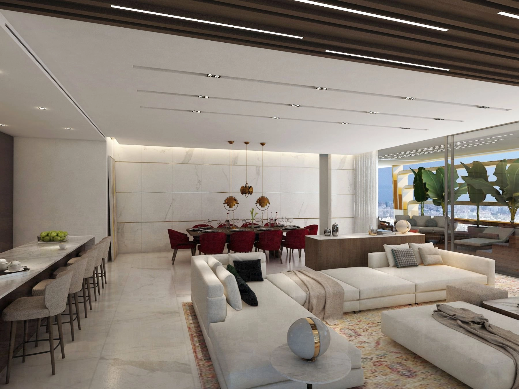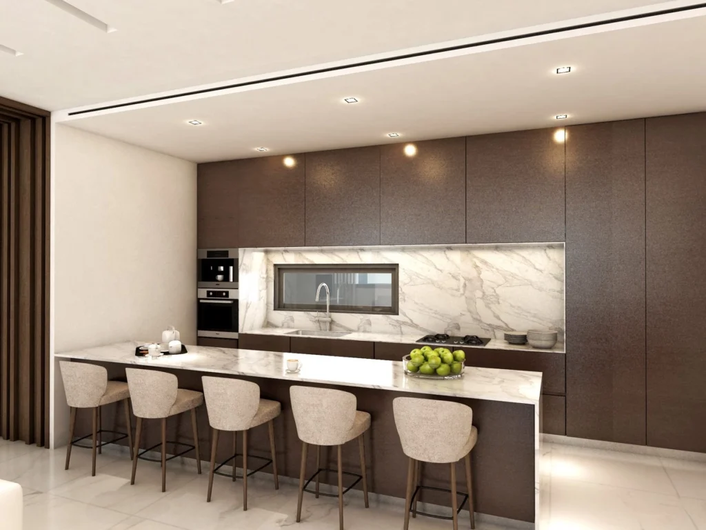 The complex stands out with its extravagant futuristic architectural design, excellent interior finishes, high-quality materials, and breathtaking panoramic views of the sea and Larnaca Salt Lake.