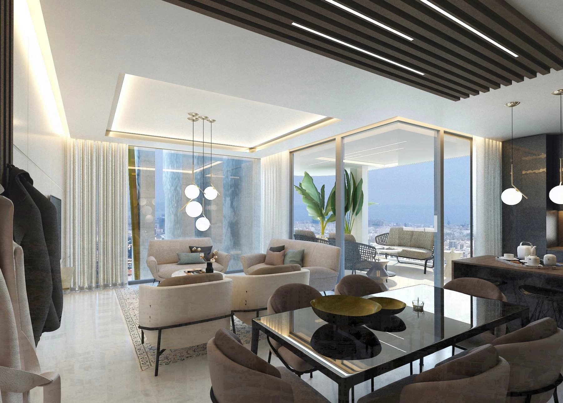 The complex stands out with its extravagant futuristic architectural design, excellent interior finishes, high-quality materials, and breathtaking panoramic views of the sea and Larnaca Salt Lake.