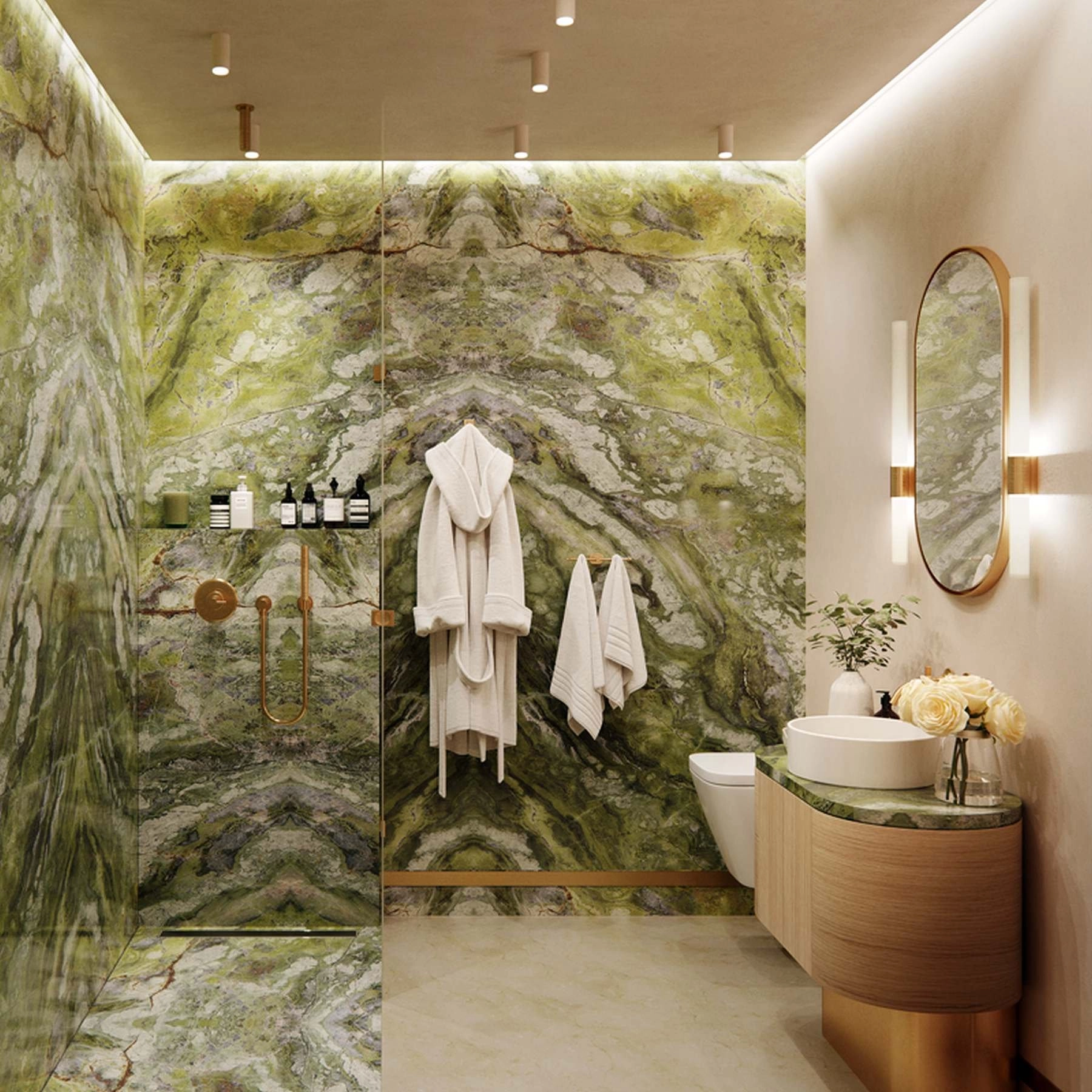 Designed by Parisian aesthete Thierry Lemaire, the apartments, inspired by the art deco influences, feature muted tones of marble and wood, complemented by glimmers of copper and gold tones that mimic the effect of the Cyprus sun.