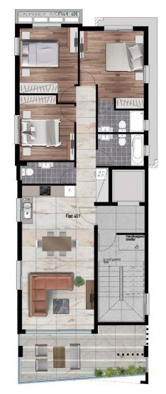 The 4-story development features spacious 3-bedroom apartments and a penthouse with a large roof terrace. Each apartment occupies a whole floor, allowing residents to enjoy enhanced privacy and comfort. The penthouse boasts a private access to the roof garden, complete with a comfortable sitting area and barbecue area, offering panoramic views of the stunning Salt Lake sunsets.