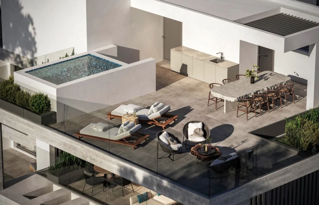 The development features luxurious 2-3 bedroom apartments, carefully designed with elegance and modernity in mind. Every detail has been carefully considered, from the high quality finishes to the expansive double glazed windows that offer stunning views of the surrounding cityscape. Whether relaxing by the rooftop pool, marveling at the panoramic views or finding serenity on the beautifully landscaped verandas, there is an unparalleled enjoyment of city life.