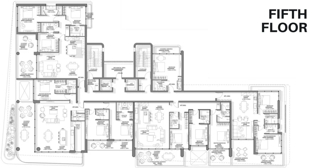 The apartments and penthouses are finished to exacting standards with contemporary materials enhancing spacious open plan layouts. With underfloor heating, and concealed VRV systems, modern comforts are seamlessly integrated. Italian-designed kitchens with Corian surfaces exude modern minimal aesthetics. The ground floor features leisure facilities like a gym, coffee shop, and boutique stores, ensuring ultimate lifestyle convenience.