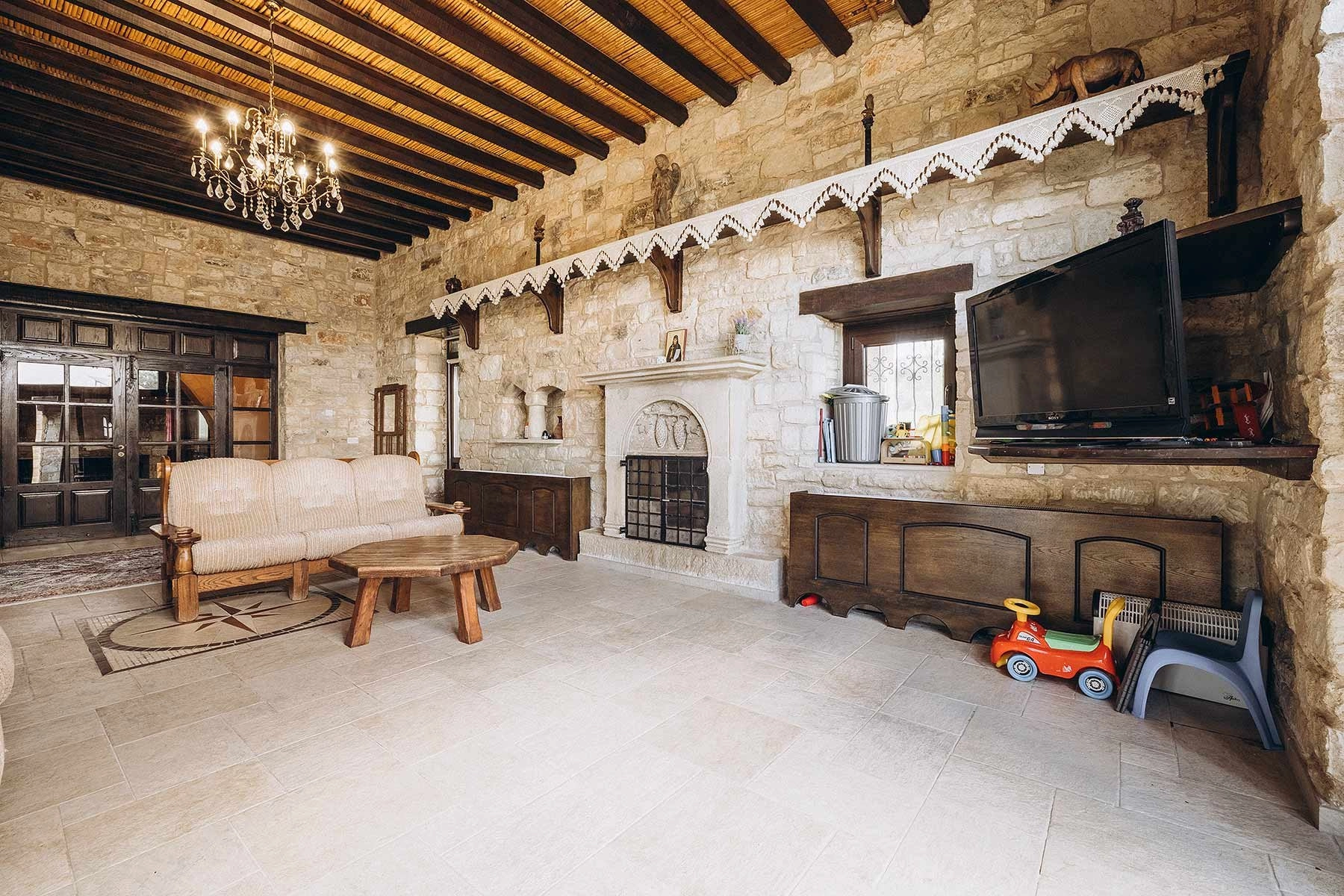 Designed as a single-level dwelling, this unique property has a total covered area of 330 sq.m. Stone clad walls, high wooden beamed ceilings, solid wood window shutters, stone fireplace, rustic furniture, and wardrobes, coupled with village style interior décor, produce an amazingly tranquil atmosphere.
