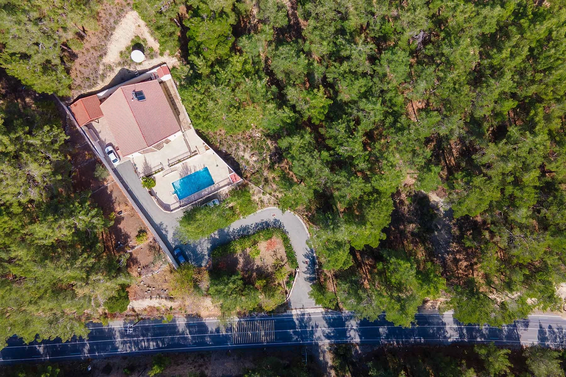 The villa boasts a large private swimming pool and ample patio/terrace space, perfect for entertaining guests. Situated on a vast 1624sqm plot with mature trees and landscaped gardens, the property offers tranquility amidst forest pine trees and stunning elevated views of the mountains. The kitchen, equipped with modern appliances, leads to an external purpose-built barbecue area and a covered wooden pergola. The property features underfloor heating, solar water heating, double glazing, a security alarm system, and a private road, all contributing to the comfort and privacy of your life.