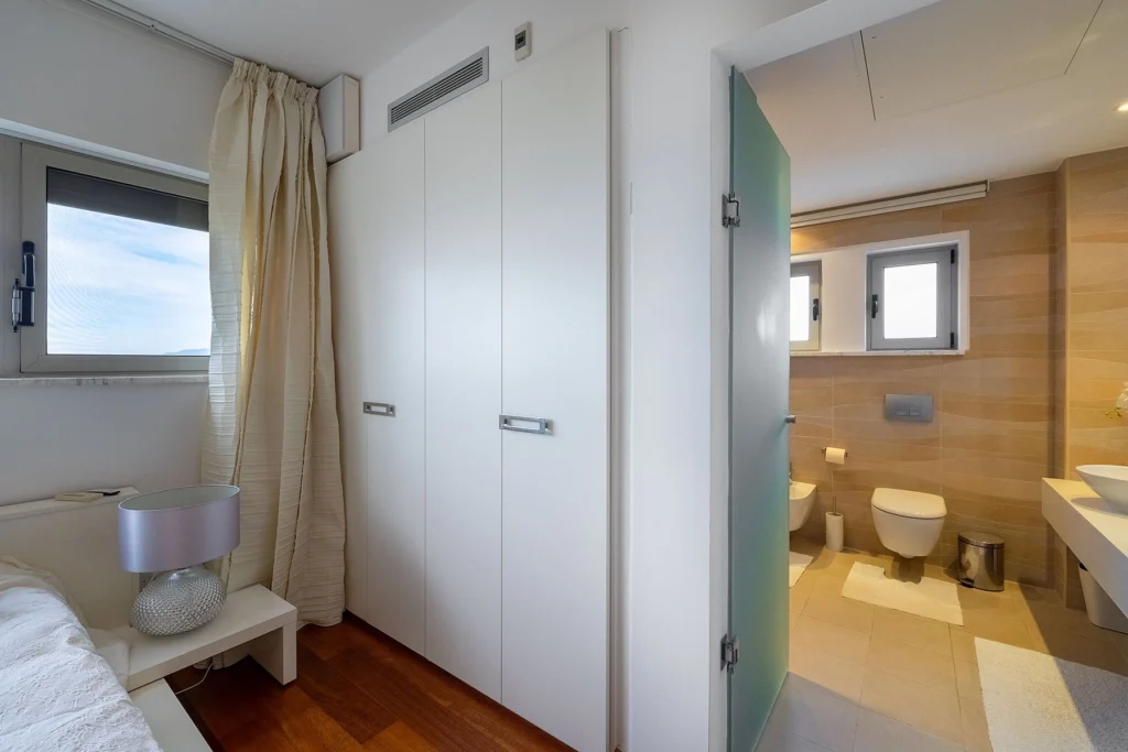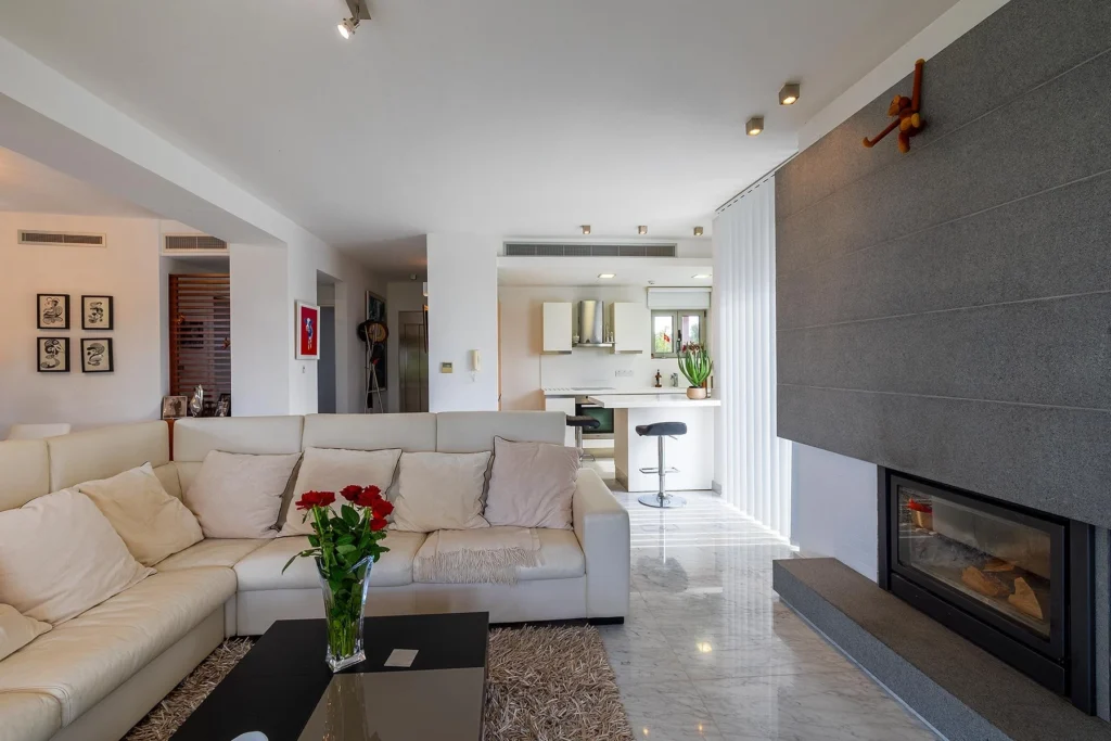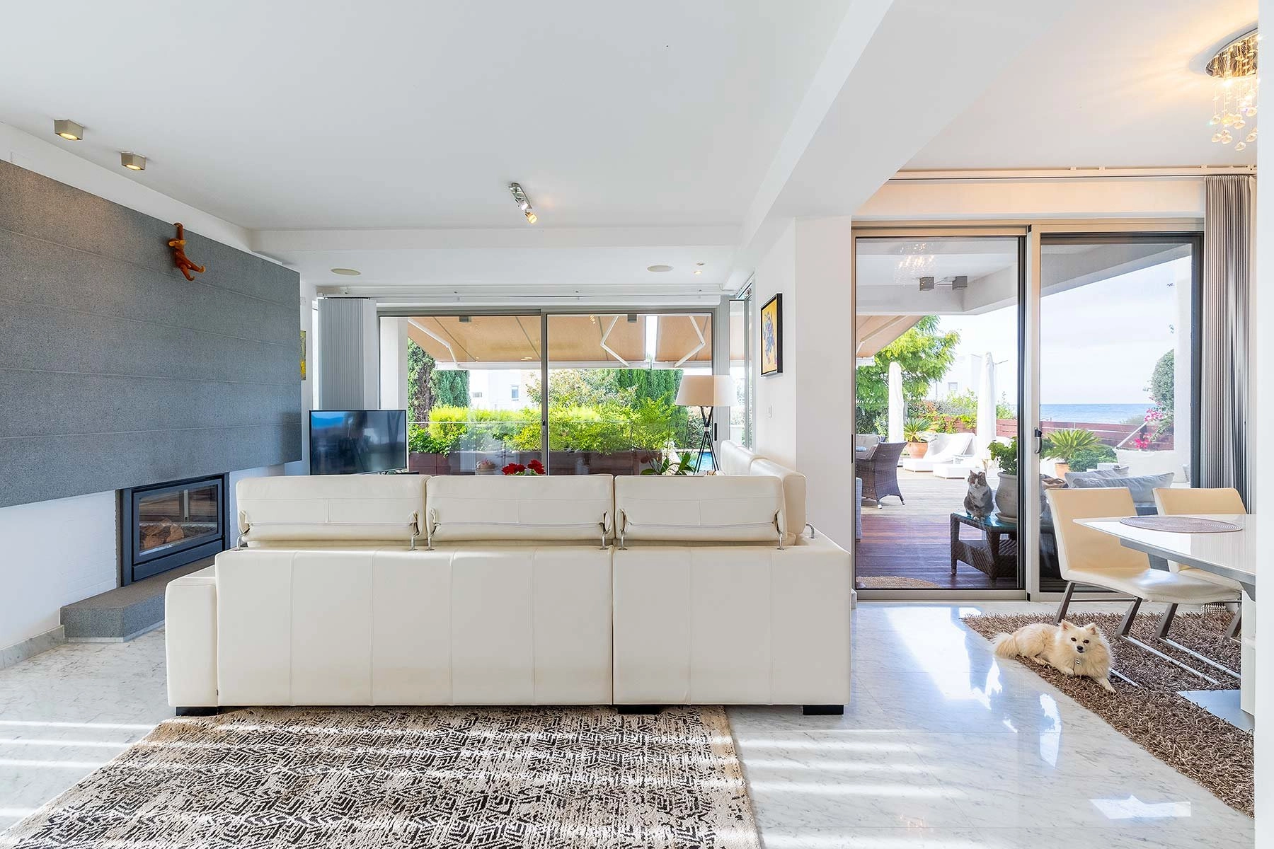 The villa features a roof terrace with a Jacuzzi, providing a perfect retreat with panoramic views. Inside, indulge in modern amenities such as a fireplace, smart-home technology for lighting and music, a home cinema, a lift and a sauna. Additional features include VRV heating, air conditioning, solar panels, covered parking for two cars, a garden with irrigation system, and a security alarm. The outdoor space is enhanced with a large swimming pool and a barbecue area, completing this residence’s harmonious blend of sophistication, comfort, and convenience. And the Mediterranean sea at your doorstep is a luxury of its own.
