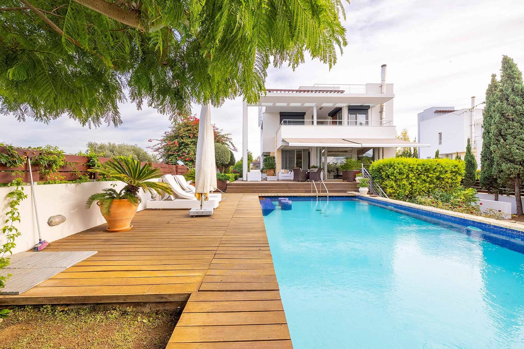 The villa features a roof terrace with a Jacuzzi, providing a perfect retreat with panoramic views. Inside, indulge in modern amenities such as a fireplace, smart-home technology for lighting and music, a home cinema, a lift and a sauna. Additional features include VRV heating, air conditioning, solar panels, covered parking for two cars, a garden with irrigation system, and a security alarm. The outdoor space is enhanced with a large swimming pool and a barbecue area, completing this residence’s harmonious blend of sophistication, comfort, and convenience. And the Mediterranean sea at your doorstep is a luxury of its own.