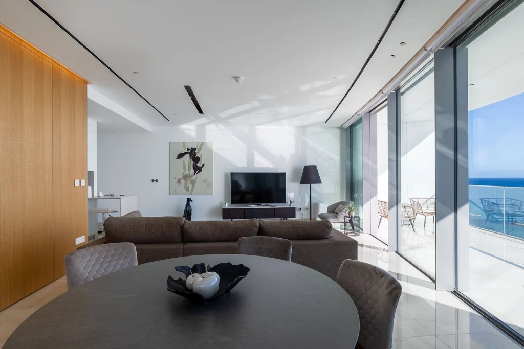 Upon entry, abundant natural light illuminates the spacious interior, accentuating stunning sea views through expansive sliding glass doors. The apartment’s design features a harmonious mix of marble, glass, stone, and stainless steel, creating a contemporary ambiance enhanced by wood and natural tones.