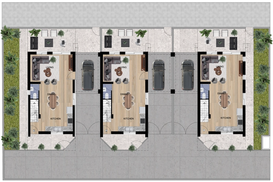 The development consists of three 3-bedroom, 2-bathroom villas, each set on its own plot with a private parking space. These exquisite two-storey villas showcase contemporary design, a well-thought-out layout, and sophisticated finishes using top-quality materials. The ground floor features a spacious living room, an elegant dining area, a modern kitchen, and a guest toilet. On the first floor, you’ll discover three cozy bedrooms and a family bathroom, with the master bedroom boasting an en-suite shower. Step onto the inviting veranda with a comfortable lounge area, offering a perfect spot to relax and unwind in the fresh air. Adjacent is the barbecue area, creating an ideal setting for gatherings with family or friends.