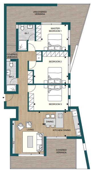 Comprising of five apartment blocks, the development offers a variety of two and three-bedroom apartments designed to suit diverse preferences and lifestyles. Each residence includes its dedicated parking space, ensuring both convenience and security, along with storage rooms for added practicality. The commitment to individual comfort and well-being extends beyond the private quarters into the shared spaces that foster a strong sense of community.