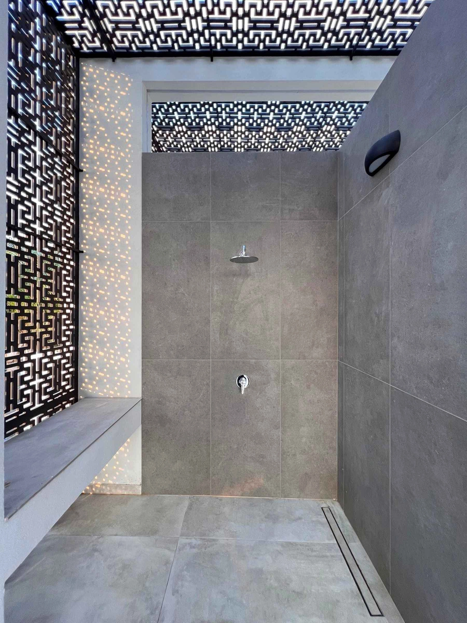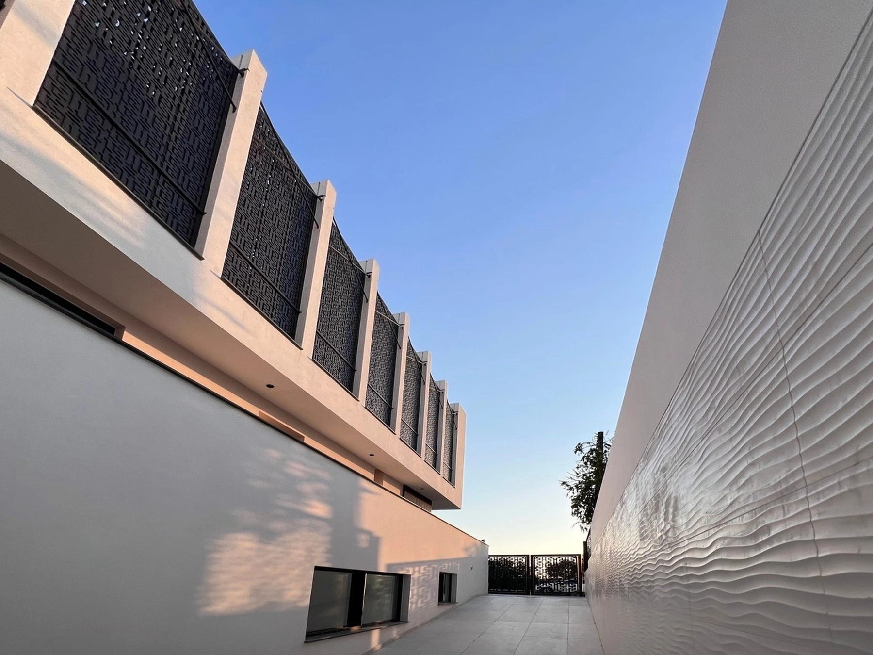 The expansive rooftop garden is covered with perforated designer PVC panels attached to an impressive modern structure and includes a bedroom and private overflowing pool, making it ideal for parties, gatherings, and barbecues, while offering unobstructed mountain views.