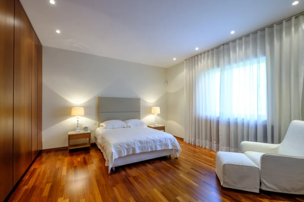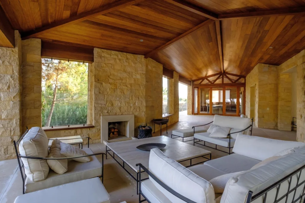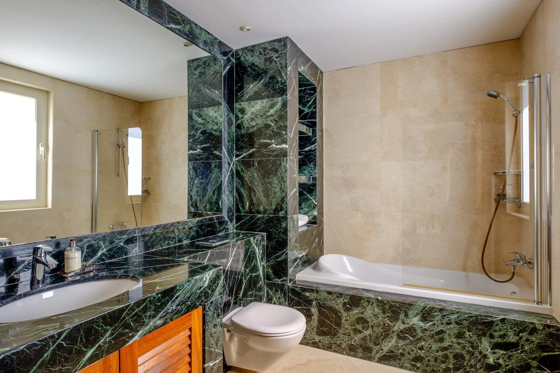 The villa features five spacious bedrooms, two staff rooms and ten bathrooms, ensuring ultimate comfort for both residents and guests. The ground floor comprises a spacious entrance hall, a bright living area with a comfortable lounge and TV area, and dining room. A welcoming kitchen-dining room is fully equipped with modern appliances. There’s also a guest WC and a separate studio-office with a fireplace. The first floor offers five bedrooms, each with its own en-suite bathroom.