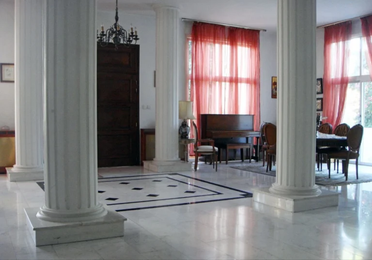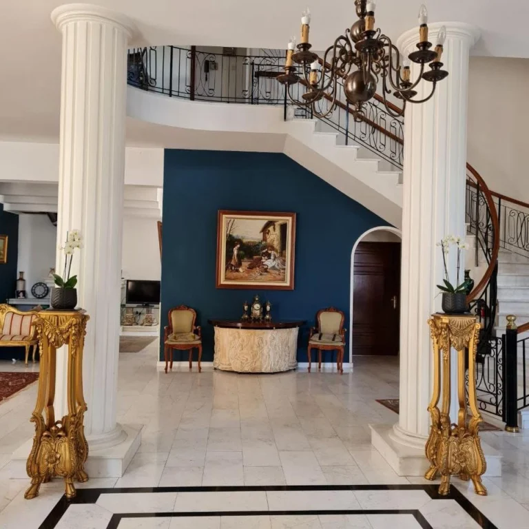 Nestled on a sprawling plot in a serene area of Nicosia, this exquisite villa is surrounded by lush greenery and mature landscaping, offering a picturesque setting for a luxurious lifestyle.