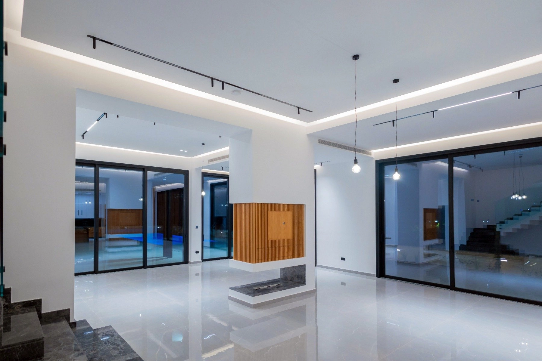 Safety and convenience are achieved with a safety guard, alarm systems, cameras, and smart home technology (KNX). Additional amenities include sound design, a saltwater swimming pool with a safety cover, and photovoltaics ensuring energy efficiency rated at A+.