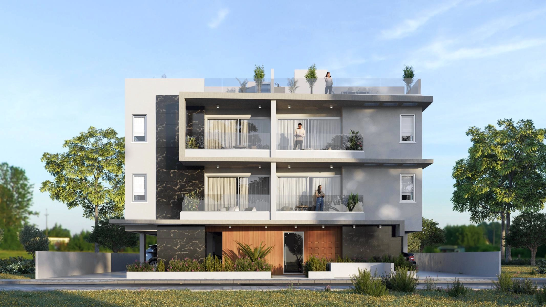 The development features a stylish two-story building housing elegantly designed 1- and 2-bedroom apartments, along with luxurious penthouses boasting private roof gardens. These outdoor spaces provide stunning panoramic views of the mountains and surrounding landscapes, offering a tranquil setting for relaxation and enjoyment of the area’s natural beauty.