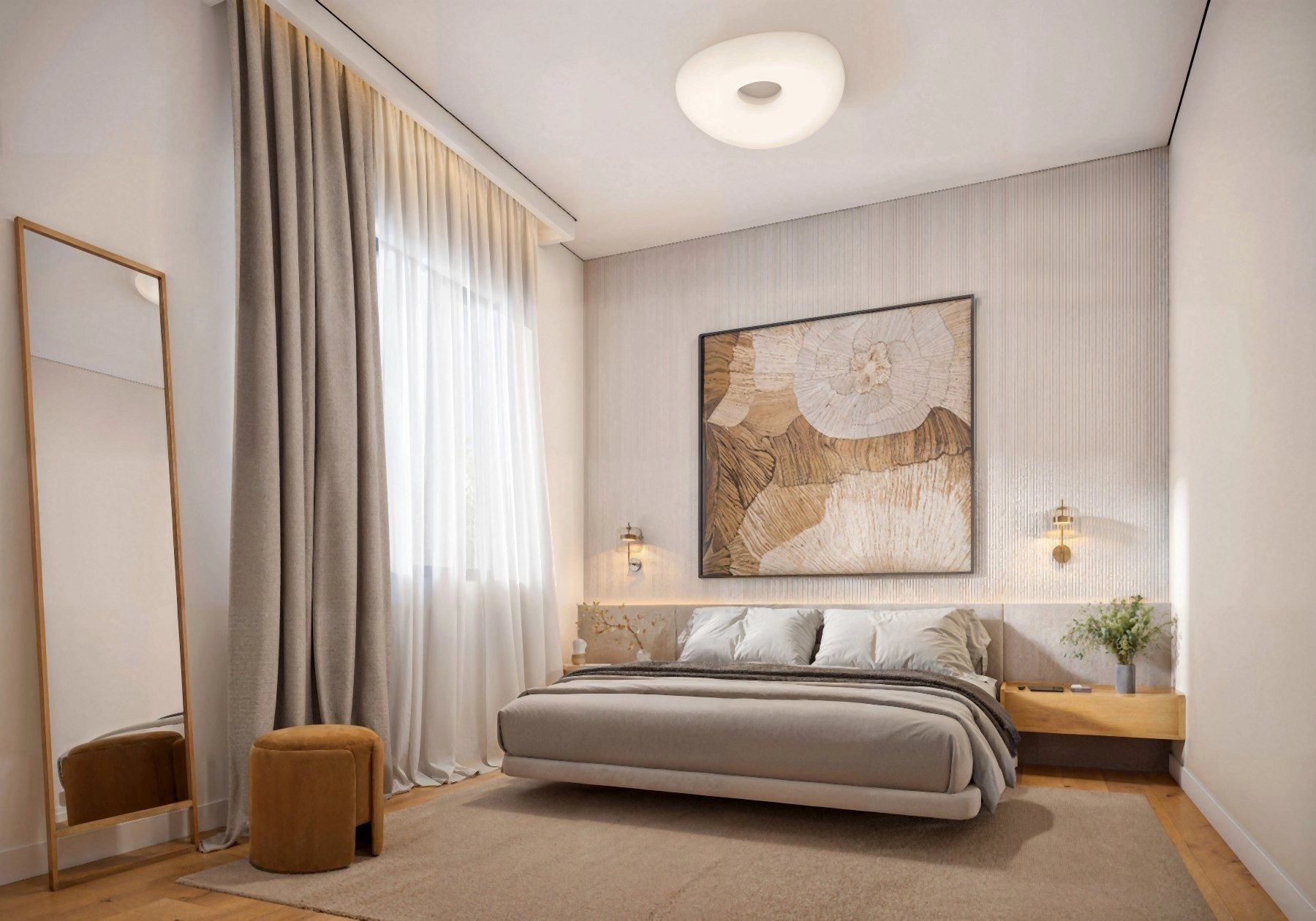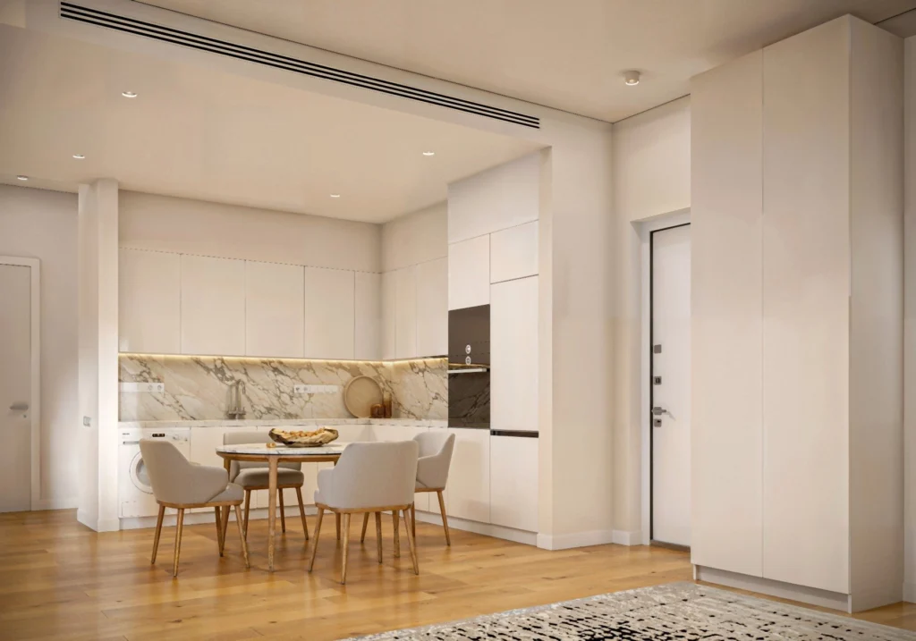 Inside, the apartments are equipped with concealed VRV air conditioning, underfloor heating, and improved thermal insulation, ensuring comfort year-round while reducing energy costs. Photovoltaic panels on the roof generate electricity, lowering utility bills. There are also provisions for smart home systems and electric vehicle chargers.