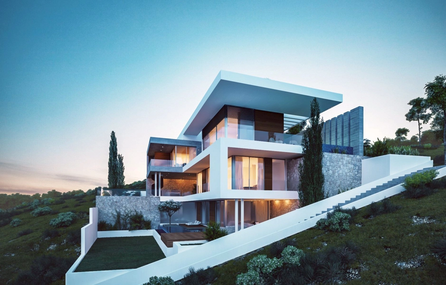 The villa showcases a bespoke modern design characterized by clean lines, open layouts, and abundant natural light and air. Key features include breathtaking sea views, three levels with three bedrooms plus one master bedroom, a swimming pool, a gym, a Jacuzzi and sauna, an elevator, and the use of alternative energy sources.