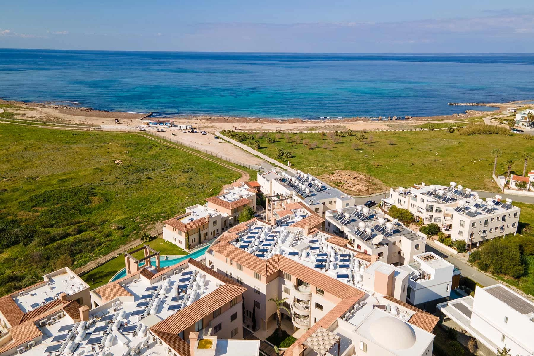 Situated just 150 meters from the sea in the heart of Kato Pafos, this exceptional complex boasts an incredible location. Mere steps away from a beautiful sandy beach and adjacent to the Pafos archaeological park, the integrity of the location is guaranteed. The elegant Mediterranean-style design, seamlessly blending with the natural surroundings, centers around a large lagoon-style swimming pool, an ideal place for relaxation. Stone paving, terracotta roofs, water features, and courtyards enhance the development’s distinctly Cypriot character.