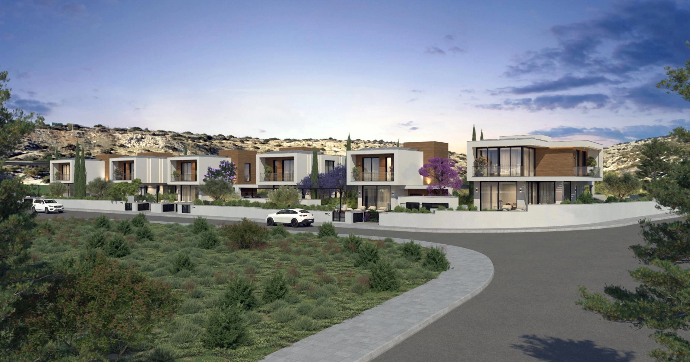 Interior spaces include well-appointed kitchens, dining areas, and living rooms on the ground floor, with luxurious master suites and additional bedrooms on the upper level. Each home offers a private landscaped garden, an infinity-edge swimming pool, a relaxation zone, and a barbecue area, perfect for enjoying the Mediterranean climate.