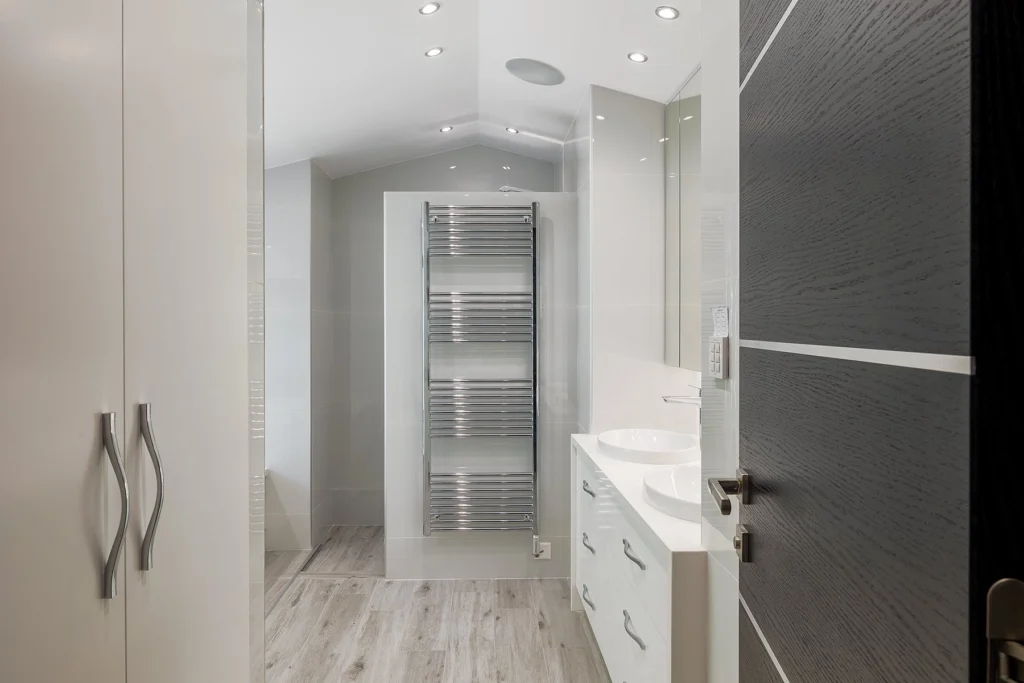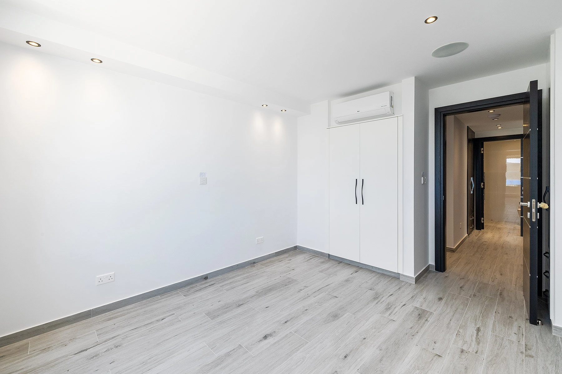 The ground floor features an open layout that connects with the garden, emphasizing indoor-outdoor living. On the left aisle, two bedrooms have direct access to the outdoor area. The central part of the villa, comprising the kitchen, dining area, and living space, benefits from south orientation, ensuring plenty of natural light. The right aisle completes the layout with three additional bedrooms, including the master bedroom, which features a hidden TV. Facing west, these bedrooms offer unparalleled sunset and sea views.