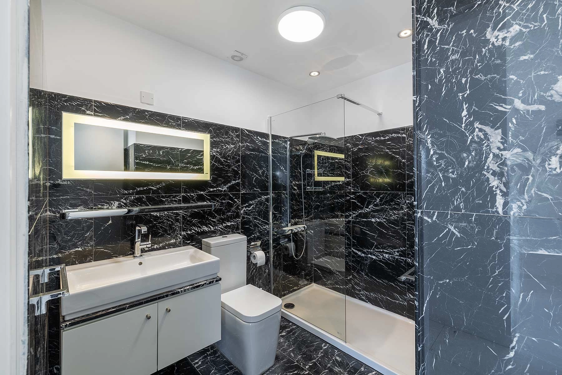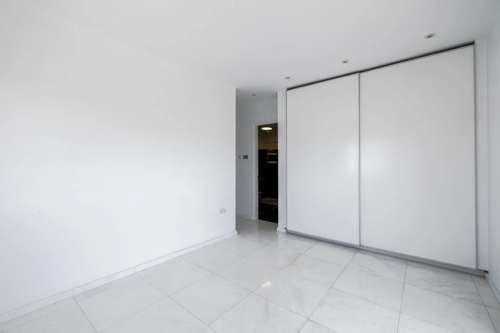 The master bedroom includes fitted wardrobe and a walk-in en-suite shower room. The second and third bedrooms both have fitted wardrobes and share a stylish family bathroom. Each room is equipped with new air conditioning units for optimal comfort.