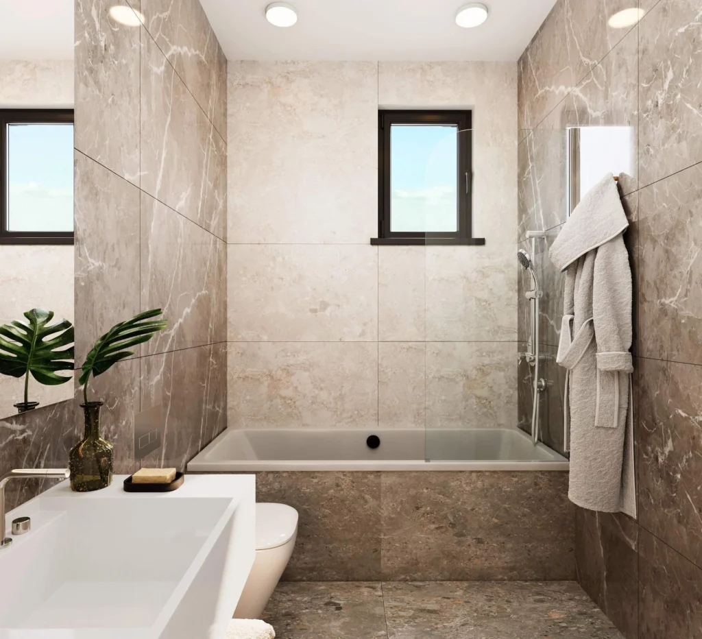 The apartments, available in thoughtfully designed one and two-bedroom layouts, boast open-plan living spaces, large windows for abundant natural light, and private covered balconies. Each home is finished with elegant touches, from marble-look porcelain tiles to modern kitchen cupboards and sleek sanitary ware. Each unit comes with covered parking and a private storeroom for added convenience.