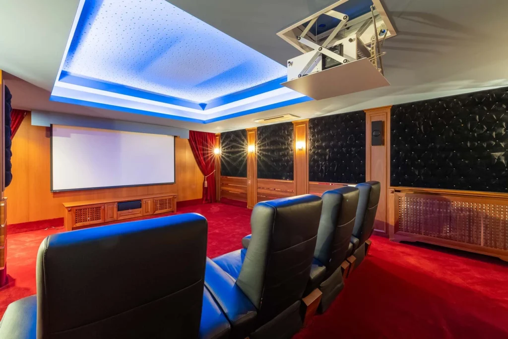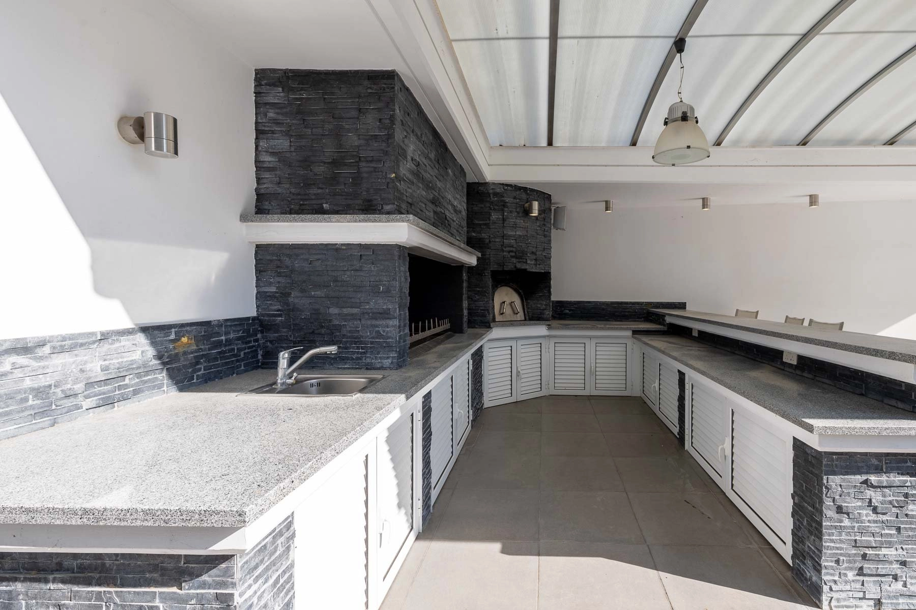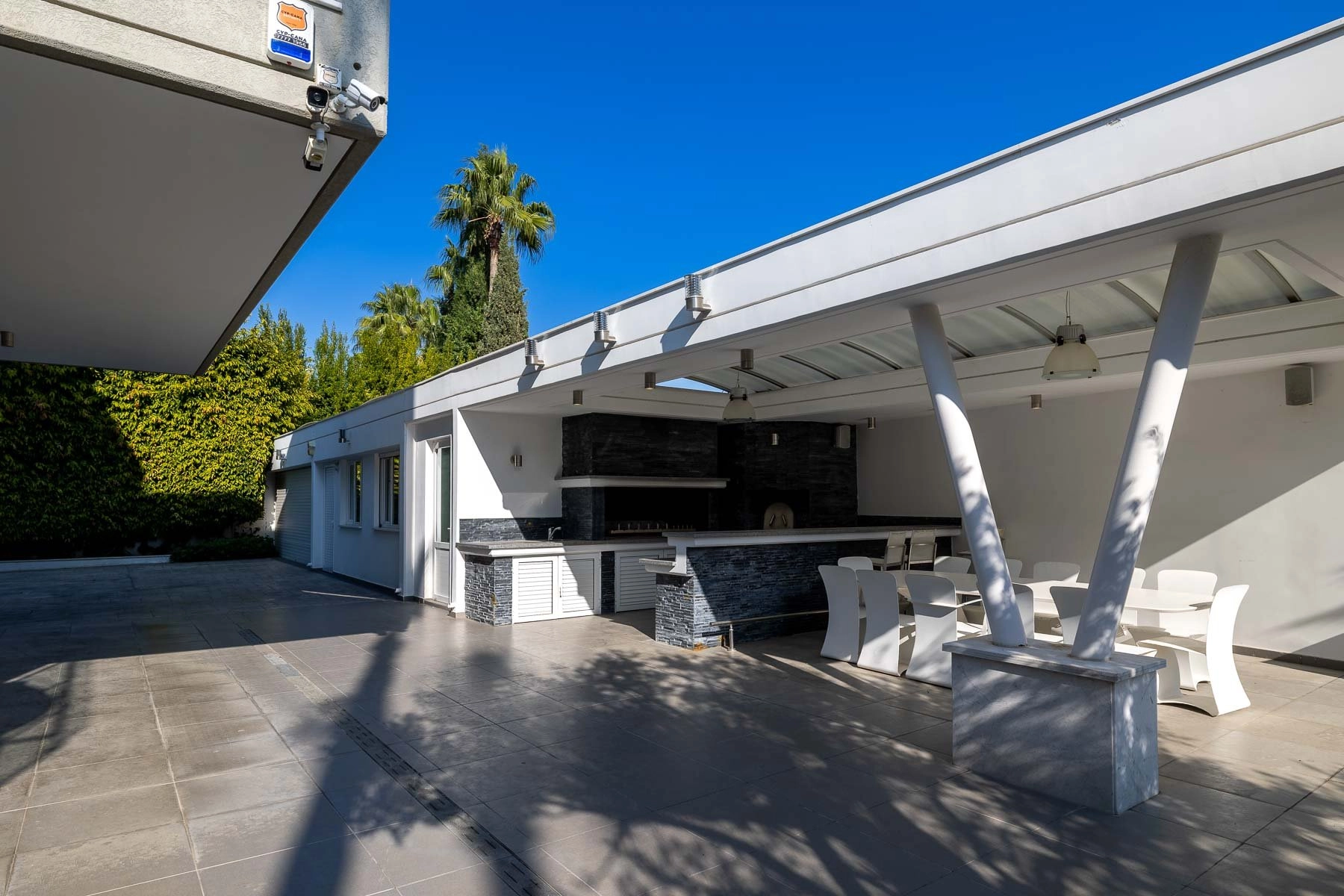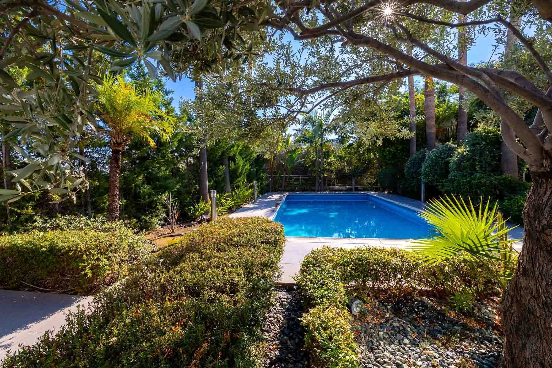 The ground floor offers a gym, massage room, sauna, cinema room, auxiliary kitchen, laundry, and pantry. Guests or staff can utilize a separate guest house. The property includes parking for two cars, a beautifully landscaped garden with a private swimming pool, and a covered barbecue area.