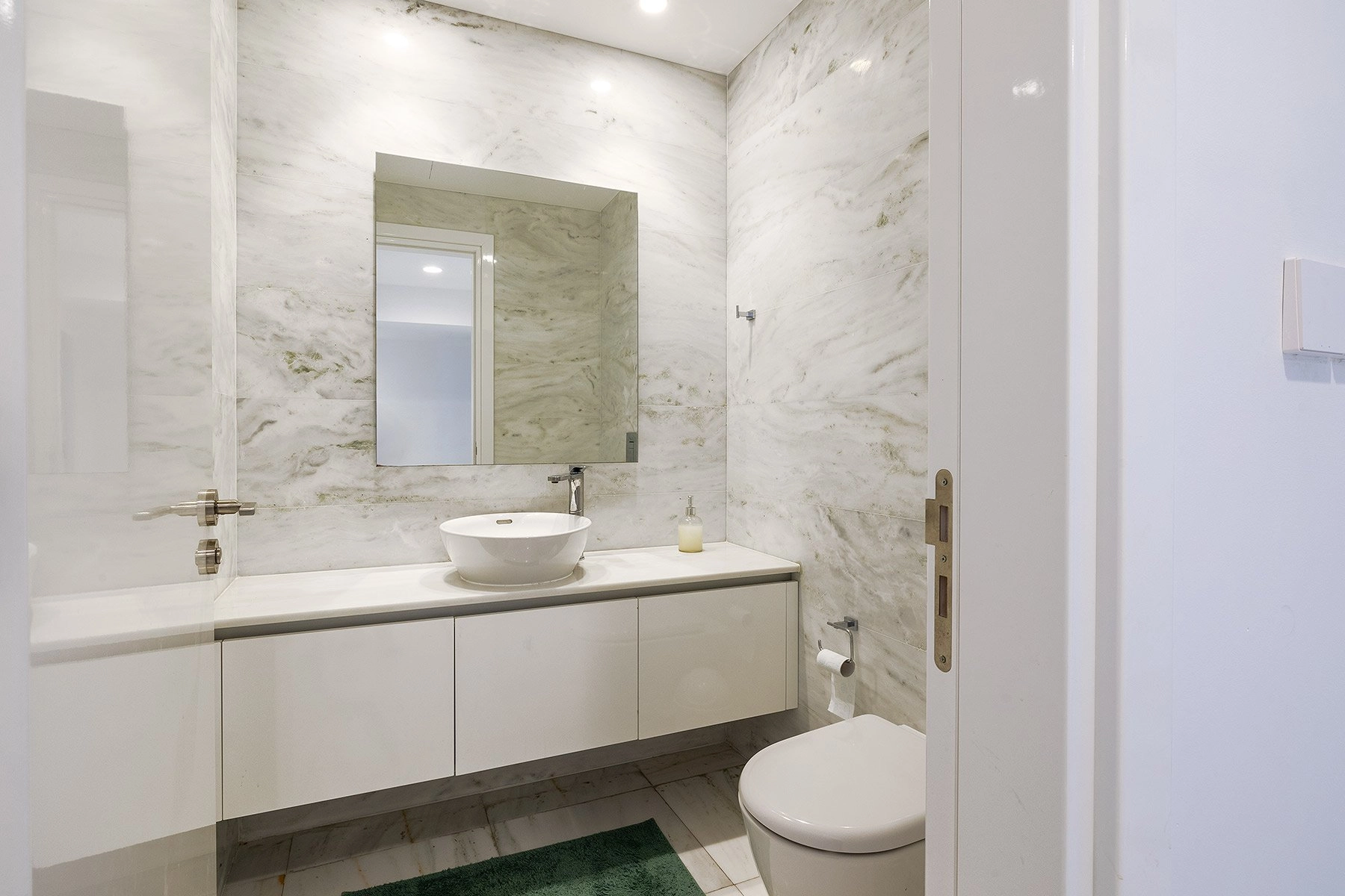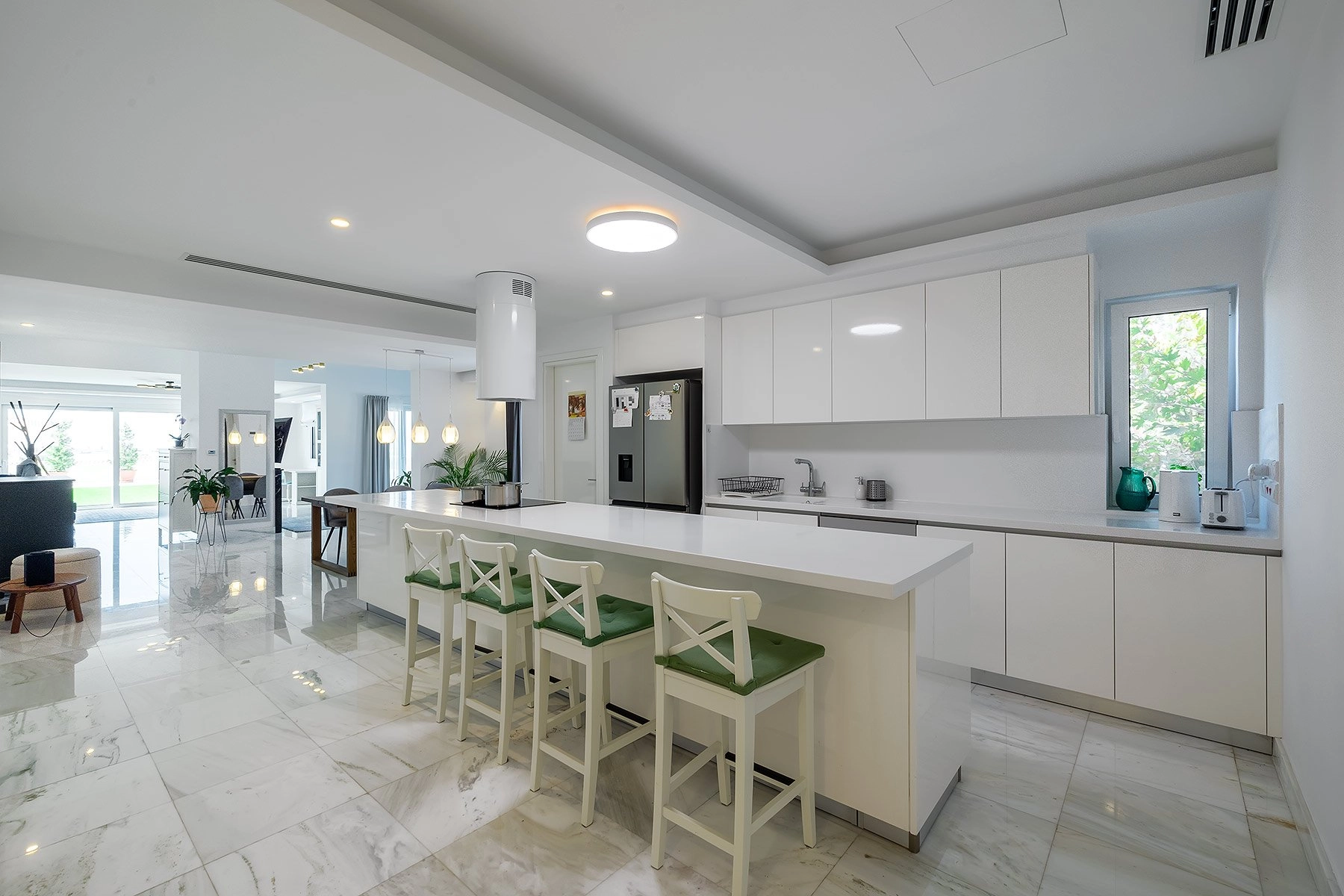 The penthouse features a spacious entrance hall, a bright living area with a comfortable lounge and TV area, a dining room with a wood fireplace, and a beautiful uncovered veranda. The unit comprises 3 spacious bedrooms, all with en-suite, open plan living-dining area, guest toilet, and a kitchen zone with a comfortable island in the middle.