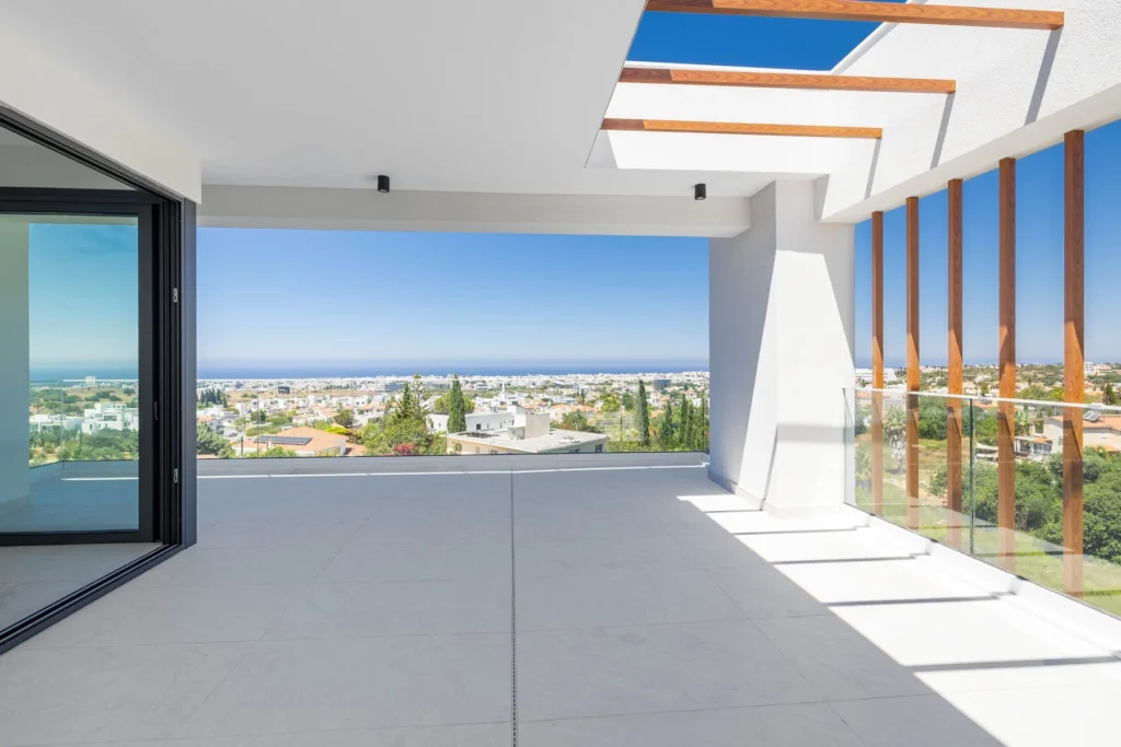 The penthouse is designed to maximize comfort and functionality, featuring spacious terraces and verandas that provide a space for relaxation in the open air with panoramic views of the city and sea. Large glass panels allow natural light to fill the interiors and connect the living spaces to the outdoors, while the glass balustrades ensure minimal visual obstruction.