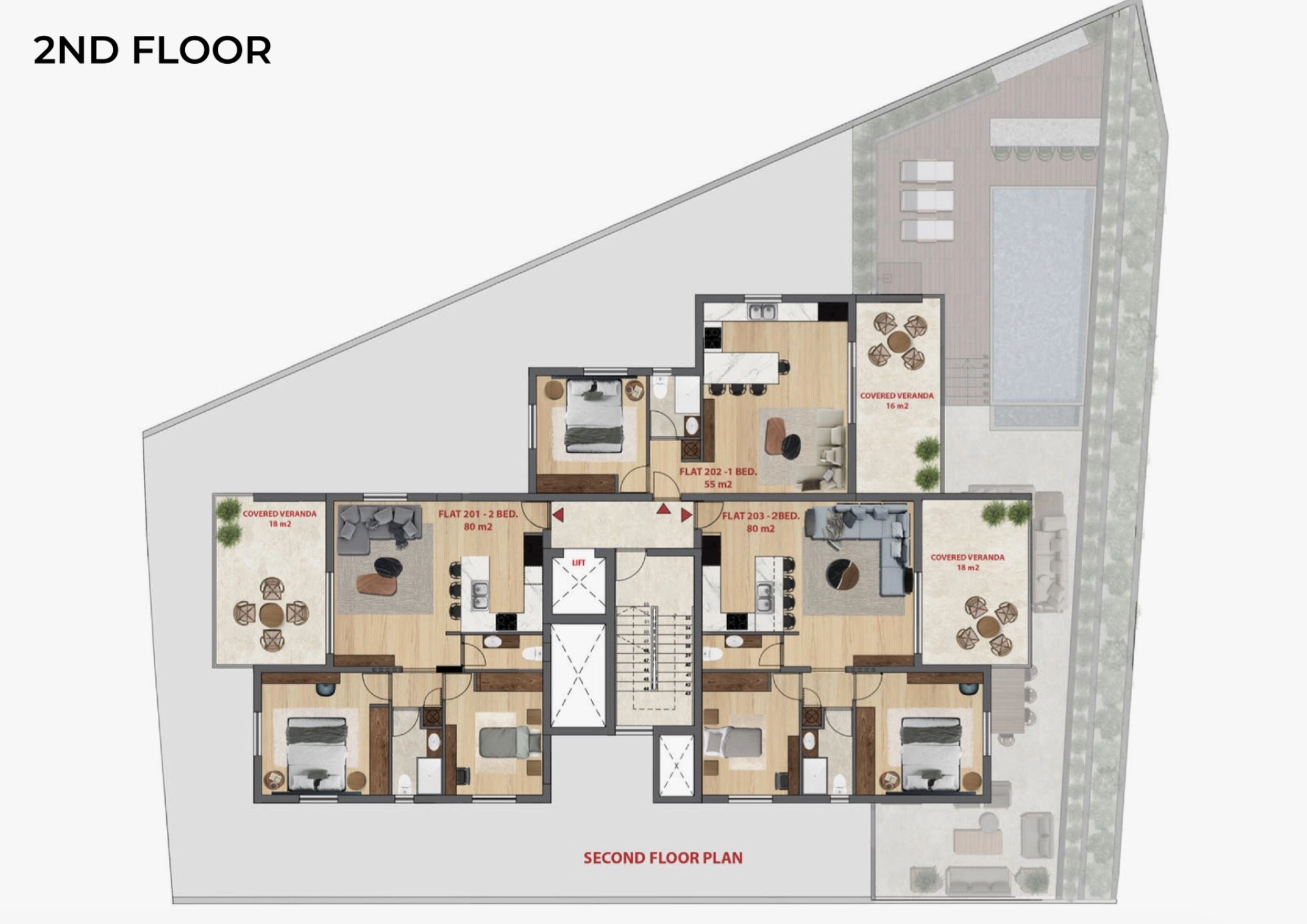 State-of-the-art amenities include a smart intercom system, keyless entry with a badge, a private alarm and camera system for each flat, and a photovoltaic system to reduce energy costs. Residents benefit from gated covered parking, a lift, and beautifully lit landscaped surroundings.