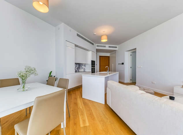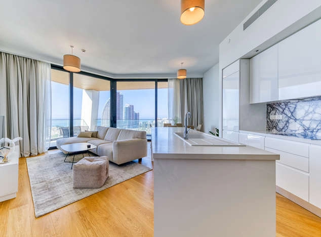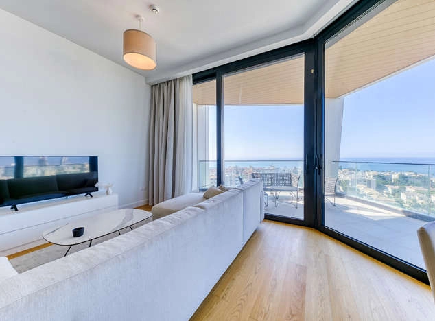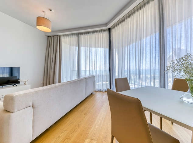 This exceptional two-bedroom apartment epitomizes modern luxury and cutting-edge technology, set in Europe’s tallest seafront residential tower in the heart of Limassol. Thoughtfully designed with meticulous attention to detail, this residence radiates quality and sophistication. The Italian-designed kitchen, equipped with premium Miele appliances, seamlessly blends style with functionality, while elegant wood and stone feature walls add a touch of natural warmth.