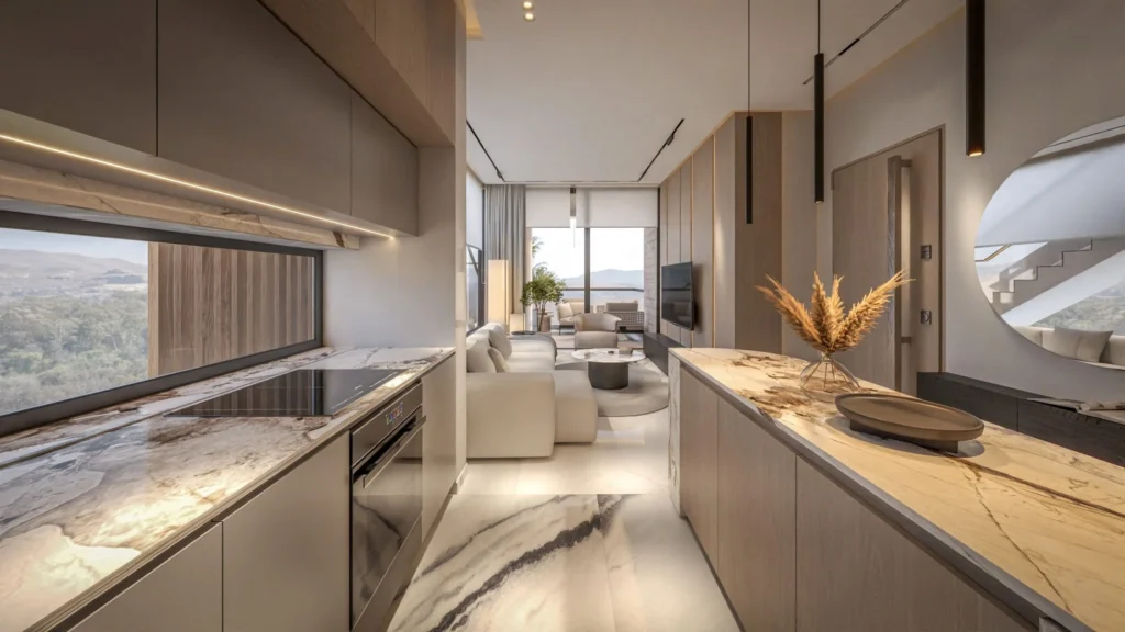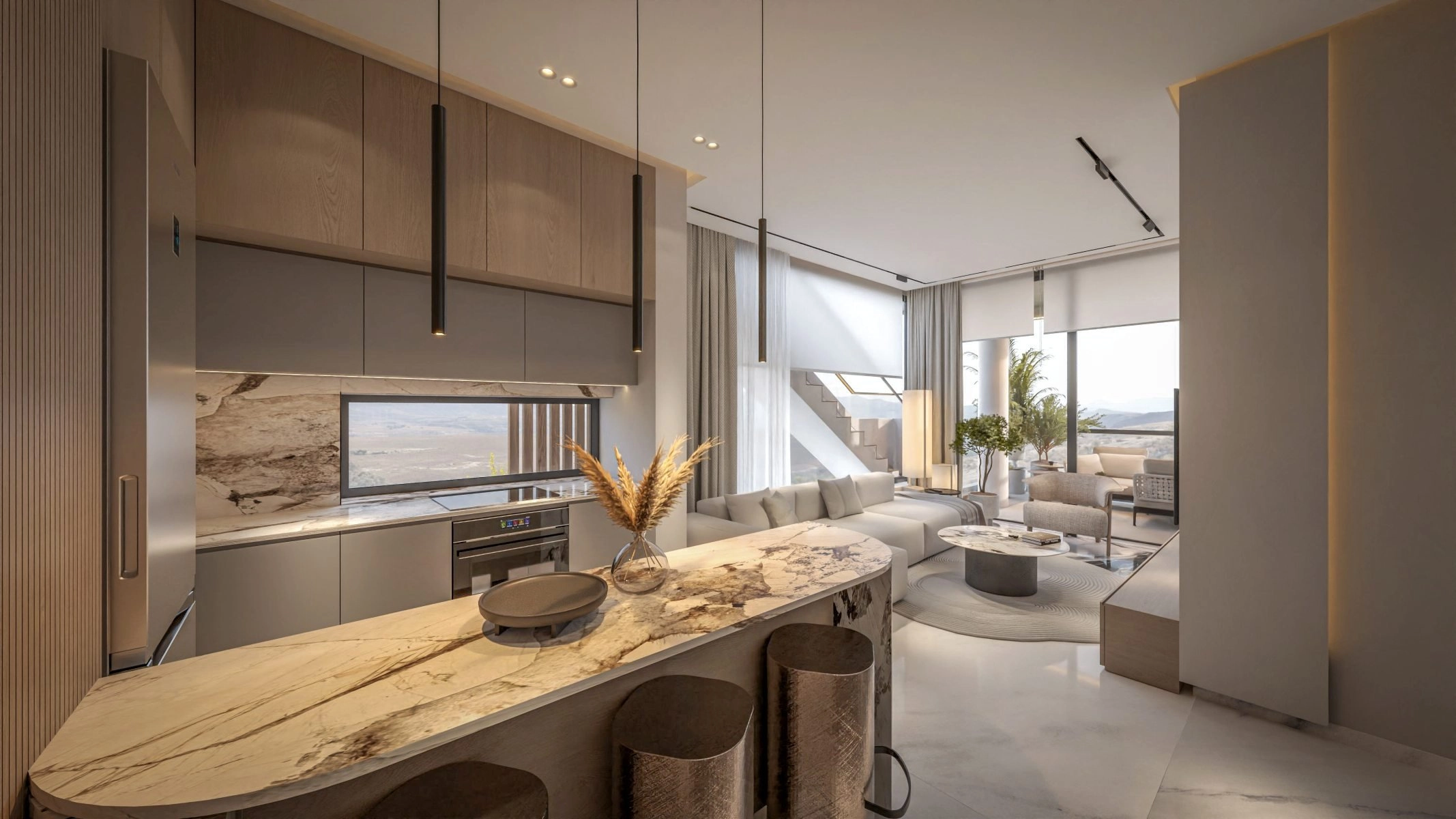 Large double-glazed windows invite plenty of natural light, offering stunning views and creating a bright, welcoming atmosphere. The kitchens are fitted with state-of-the-art appliances and elegant cabinets, providing the perfect balance between modern design and functionality.