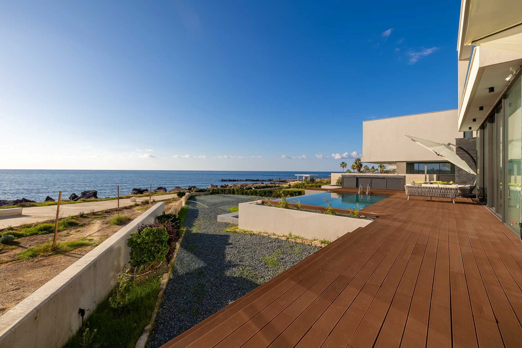 This stunning seafront semi-detached villa represents the ultimate in luxurious coastal living. The property has direct access to the most beautiful seafront promenade of Pafos. The location enjoys mesmerizing views to the best sunsets in Cyprus and the Lighthouse. The contemporary open plan living, dining, and kitchen areas on the ground level are full of light and continue outdoors by expanding to the small garden and BBQ area. The second floor has three impressively sized bedrooms, all with breath-taking sea views. The main bedroom has an en-suite bathroom with a free-standing bath and a walk-in wardrobe whilst the other two rooms have a shared bathroom with laundry space completing the second floor. This property also has the benefit of a roof terrace, perfect for sunset cocktail parties where the view is unparalleled. This semi-detached property is on the market at a very fair price, considering it is a seafront villa in Pafos. There is also the option of purchasing the adjoining property allowing for one super villa in the most desirable and accessible area of the town.