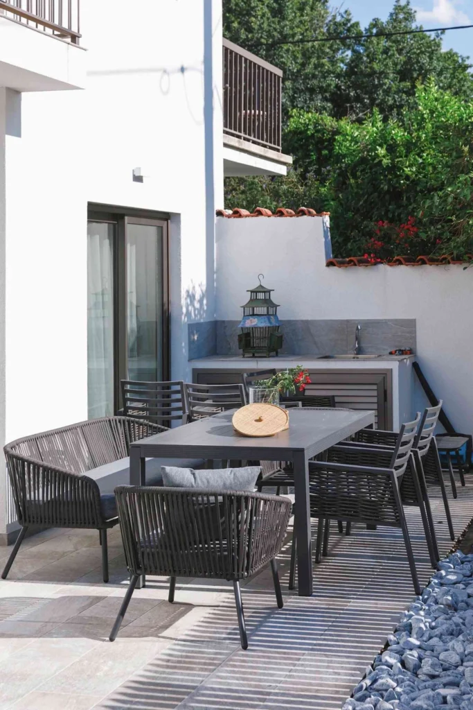 The luxurious lounge area boasts a cozy fireplace, complemented by a barbecue space and a charming garden – perfect for relaxing or entertaining. Modern conveniences include air conditioning, underfloor heating, a fully furnished kitchen with built-in appliances.